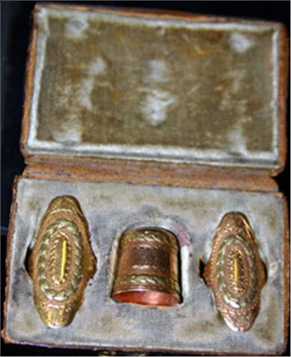 SYETUI MED FINGERBORG SAMT 2 SYRINGAR, FLERFÄRGAT GULD, 18K, OTYDLIGA SVENSKA STÄMPLAR 1788, ORIGINALETUI AV SKINN, SENGUSTAVIANSKT
