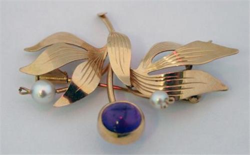 BROSCH 18K MED AMETIST SAMT ODLADE PÄRLOR, BERGMANS STOCKHOLM, 1954