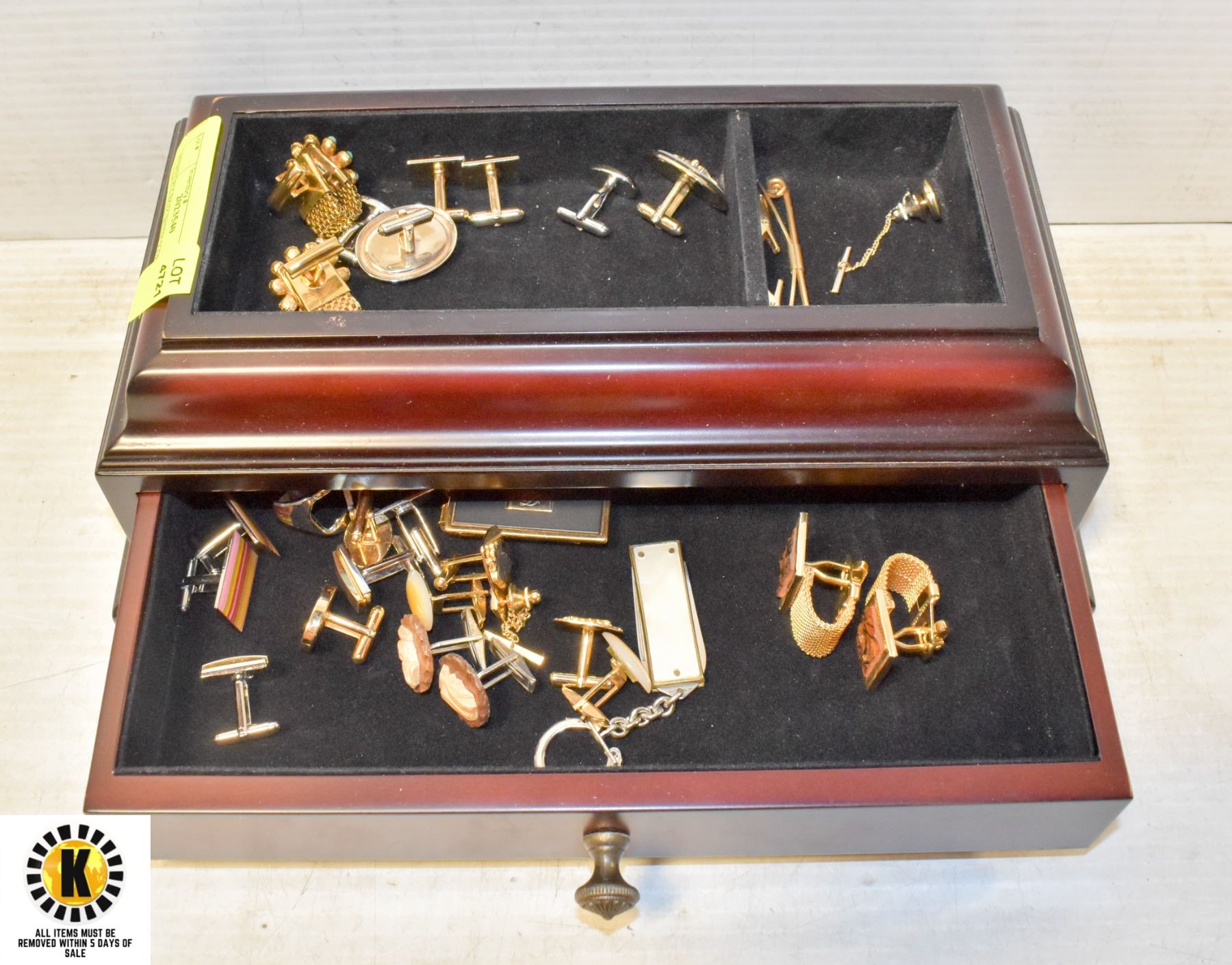 JEWELRY BOX WITH VARIOUS CUFF LINKS AND TIE CLIPS