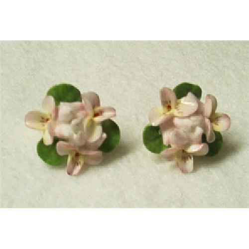 I am featuring at auction today a one of a kind set of earrings. Signed: MADE IN ENGLAND. Beautiful handset and hand decorated, Capodimonte designed earrings. Clip on style with gold toned backings. The porcelain flowers and petals are beautifully handpainted and hand designed. Lovely hand painted green leaves, with three tiny and detailed flowers with colors of pink to white flowers with tiny brown markings that form the petals and on the inside of each flower there is a tiny red enamel dot for the center. Very deligate and elegant set of Capodimonte styled Earrings.