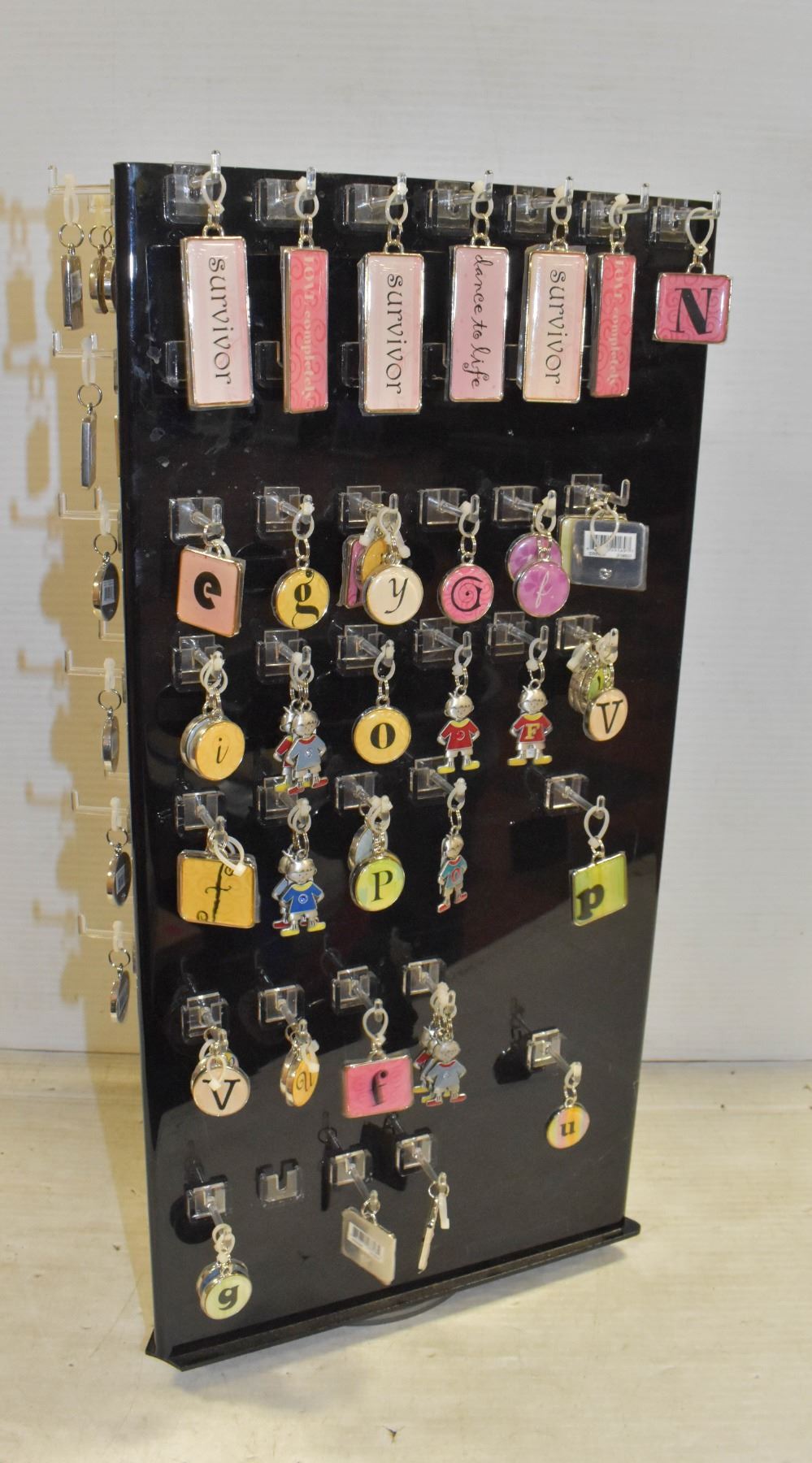 JEWELRY ROTATING STAND & CHARMS. TRIANGULAR SHAPED. MEASURES APPROXIMATELY 10" X 20" TALL. USE FOR KEY RINGS, EARRINGS, CHARMS, ETC. MORE THAN 150 "CHARMS".**ALL ITEMS MUST BE REMOVED BY 5PM MONDAY, SEPTEMBER 17, 2022. ALL REMAINING ITEMS WILL BE SUBJECT TO A $6.00 PER DAY STORAGE CHARGE. ANY ITEMS REMAINING AFTER MONDAY, SEPTEMBER 17, 2022 WILL BE CONSIDERED FORFEITED. NO REFUNDS WILL BE ISSUED FOR FORFEITED ITEMS. TO SCHEDULE A PICK UP APPOINTMENT CLICK HERE