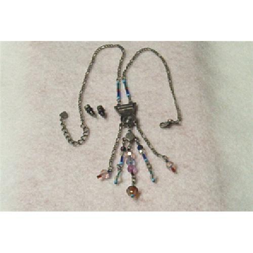 I am featuring at todays auction an absolutly beautiful Demi-Parure of a silver or nickle finished, Indian designed necklace and matching stud earrings. Decorated with two aurora borealis bezel settings, several cylinder beads in colors of teal blue,amber, royal blue and clear. Tiny turquoise colored beads are also noted. The silver or nickle plated triangle at the top with bezel set cylinder beads in color of amber, royal blues, and grey; the bottom of the triangle displays a round silver or nickle plated bezel setting which displays in the center a round aurora borealis rhinestone which is surrounded with tiny cylinder shaped beads in colors of turquoise, red, green and royal blue. Three chains flow from the bottom of this circle with the middle chain having a silver or nickle plated, bezel setting of an aurora borealis rhinestone which has another 3 sets of chains that contains both cylinder beads and round beads in the same colors, with the bottom bead in the color of amber. (A total of 5 chains). The stud earrings are also silver or nickle plated and display a 1/8 inch diameter aurora borealis rhinestone. The necklace measures 7 inches long on the inside with an extra extension chain that adds an additional 2 inches. At the end of this extension chain is a small heart. The complete total length of the necklace measures 10 inches long; the diameter of the earrings is 1/8 inch. This is a beautiful demi-parure, vintage clasp, decorated necklace with matching earrings. (A very ...