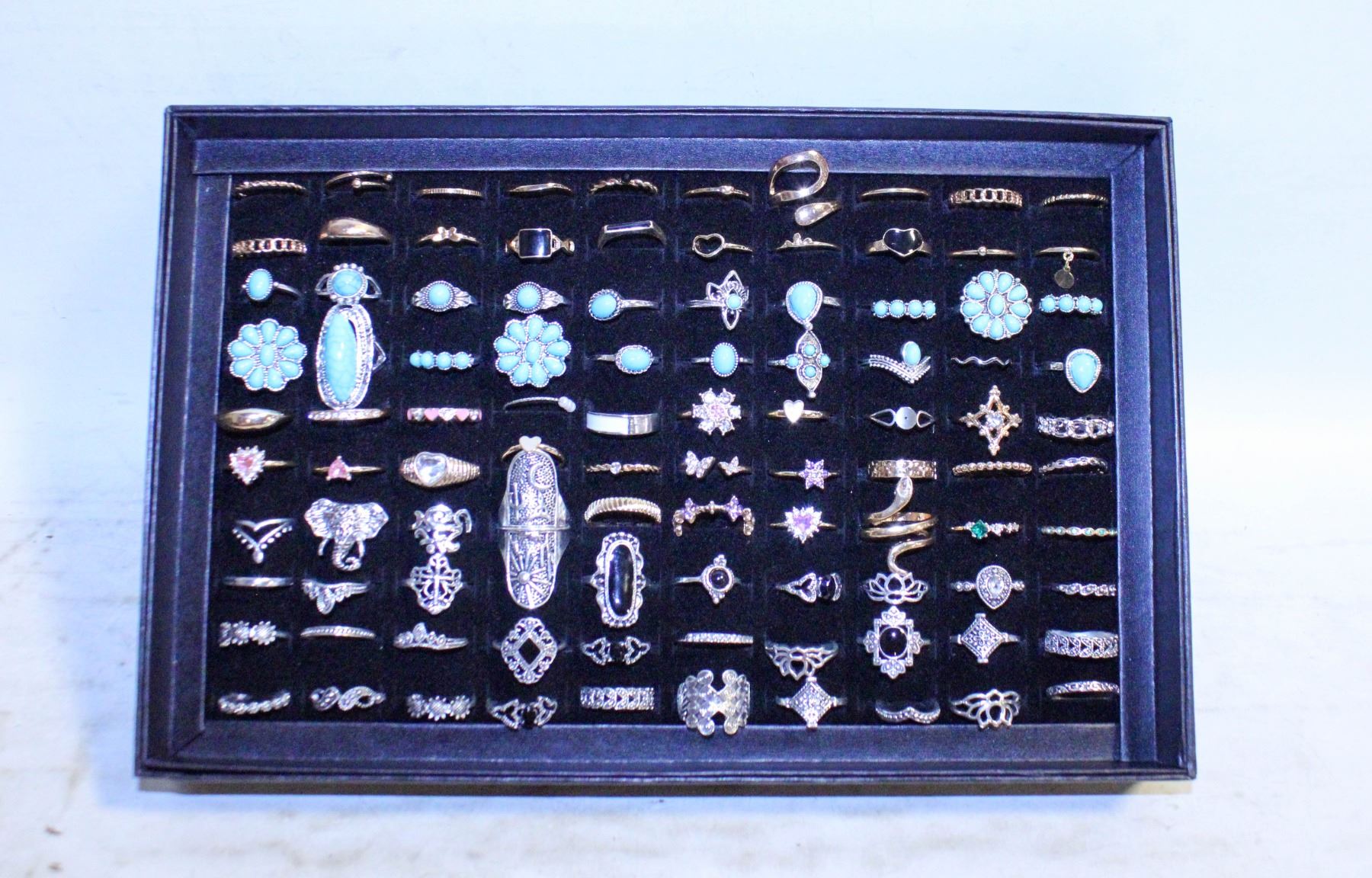 JEWELRY ORGANIZER TRAY W/100 COSTUME JEWELRY RINGS
