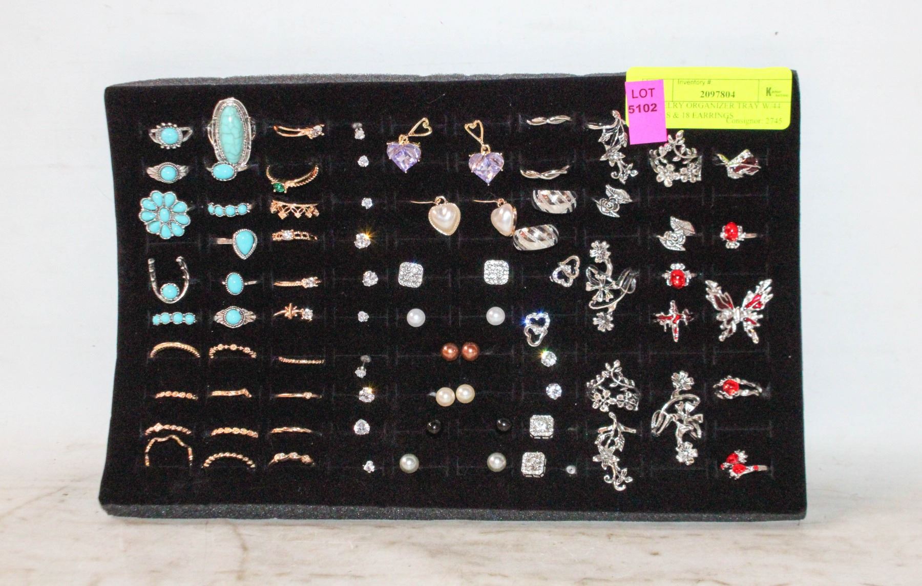 JEWELRY ORGANIZER TRAY W/44 RINGS & 18 EARRINGS