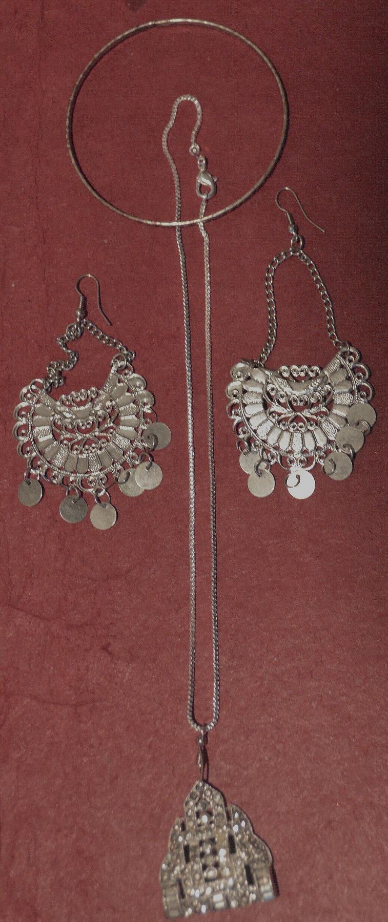 JEWELRY SET #66 - SET INDLUDES A SILVER NECKLACE, BRACELET, AND EARRINGS (CLIP EARINGS & PIERCE EARRINGS). THESE ARE CLASSIC AND UNIQUE JEWELRIES. THESE ARE BEING SOLD AS IS. NO REFUNDS