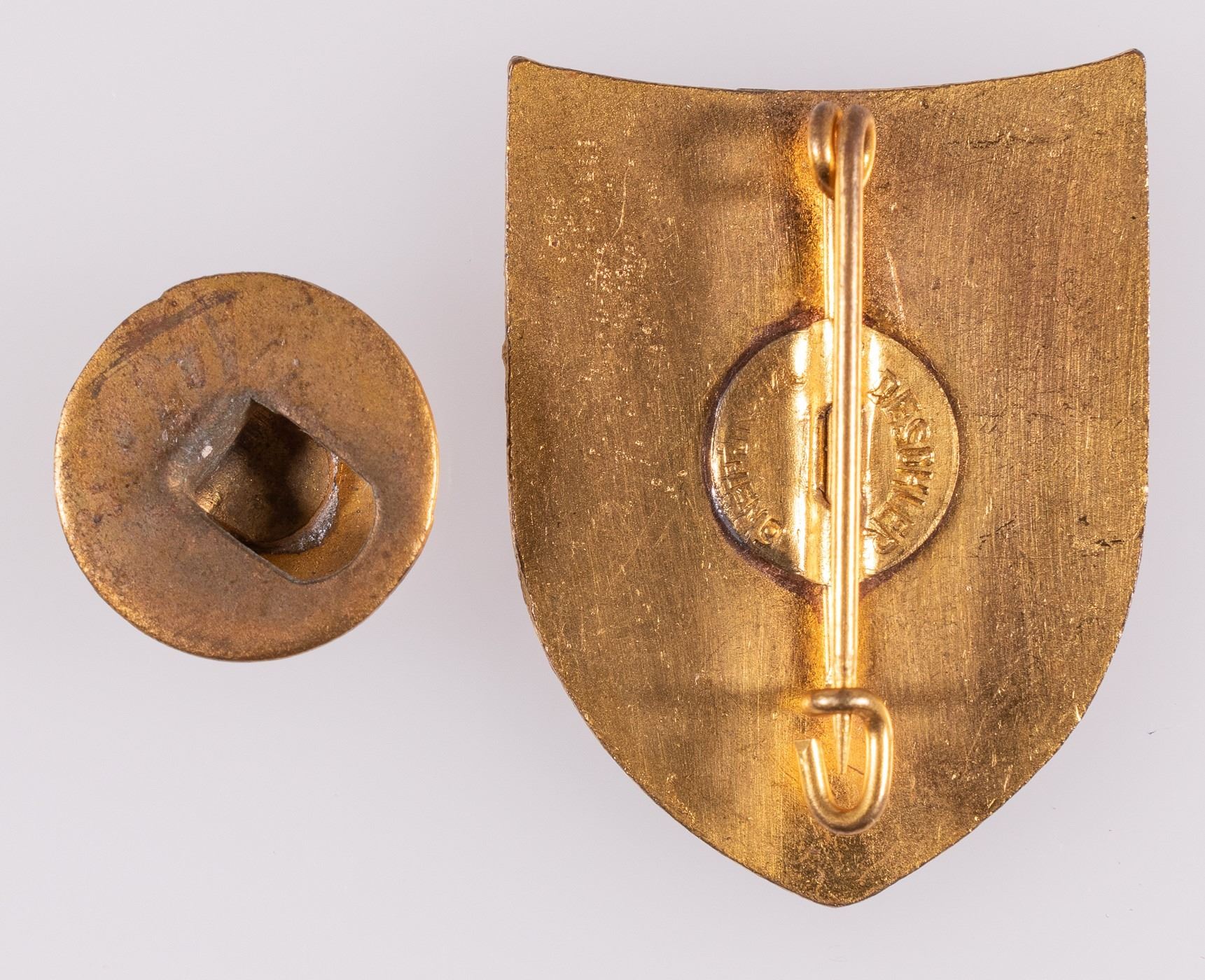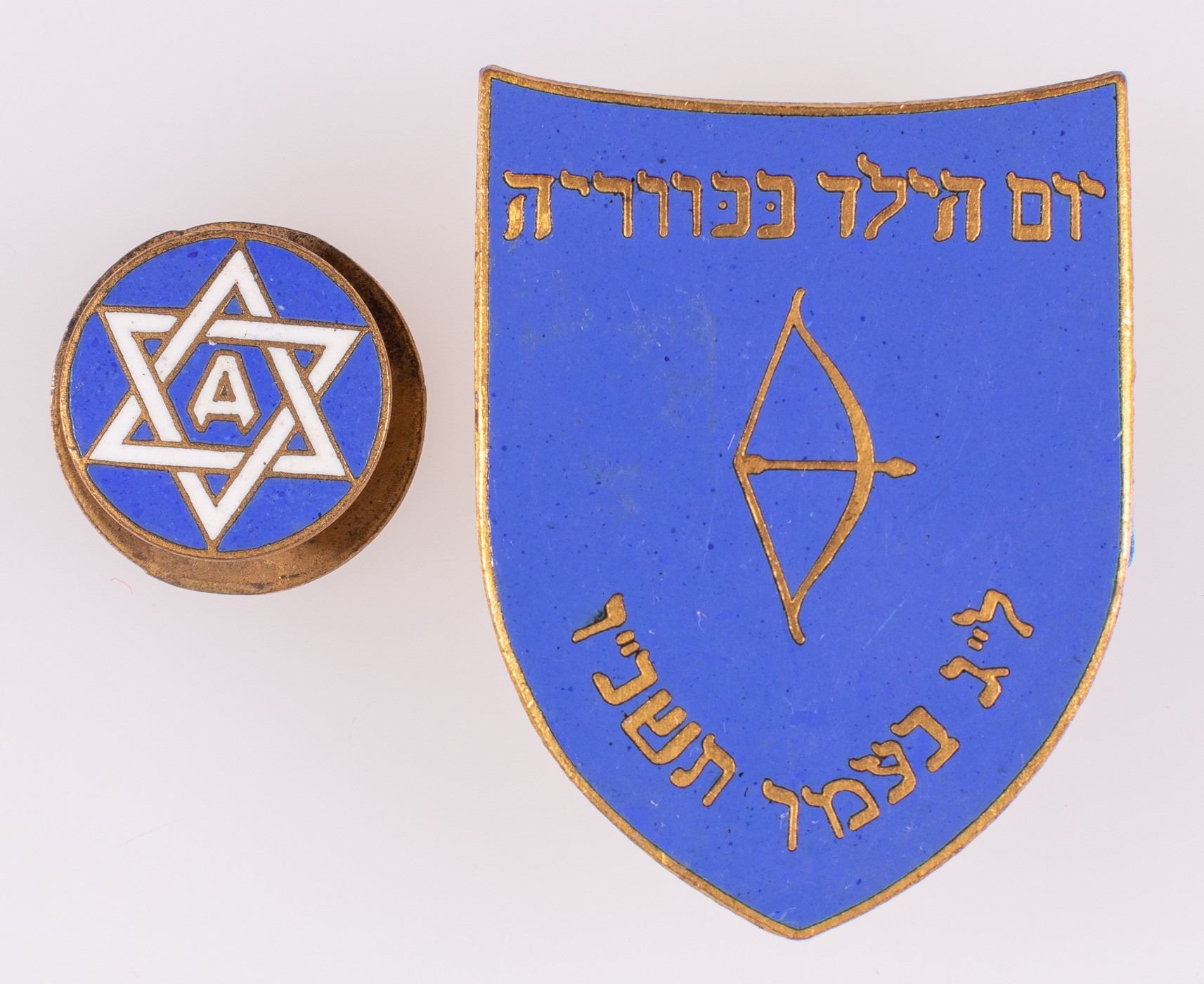 Lot of two Jewish pins possibly from the 1930s. Blue enameled shield with gold Hebrew lettering and a an archer's bow in the center. Pin back with maker's mark 'Deschler Munchen', with a small circular lapel pin, blue enamel, with a white Star of David and a small letter 'A' in the center.