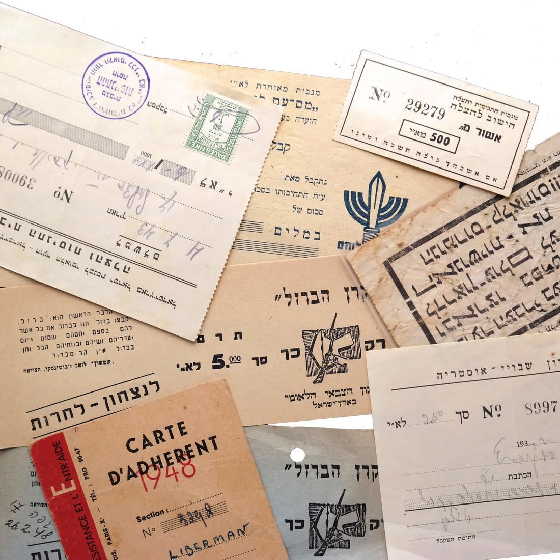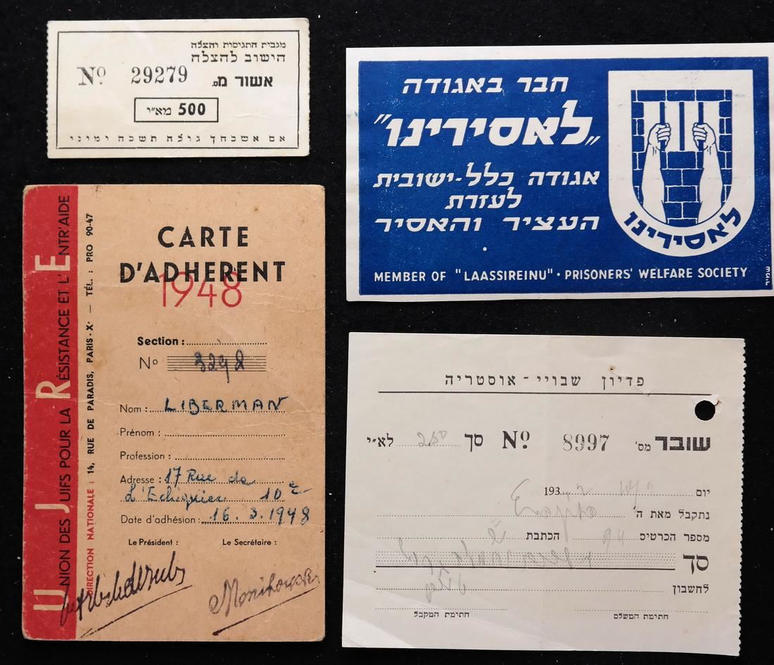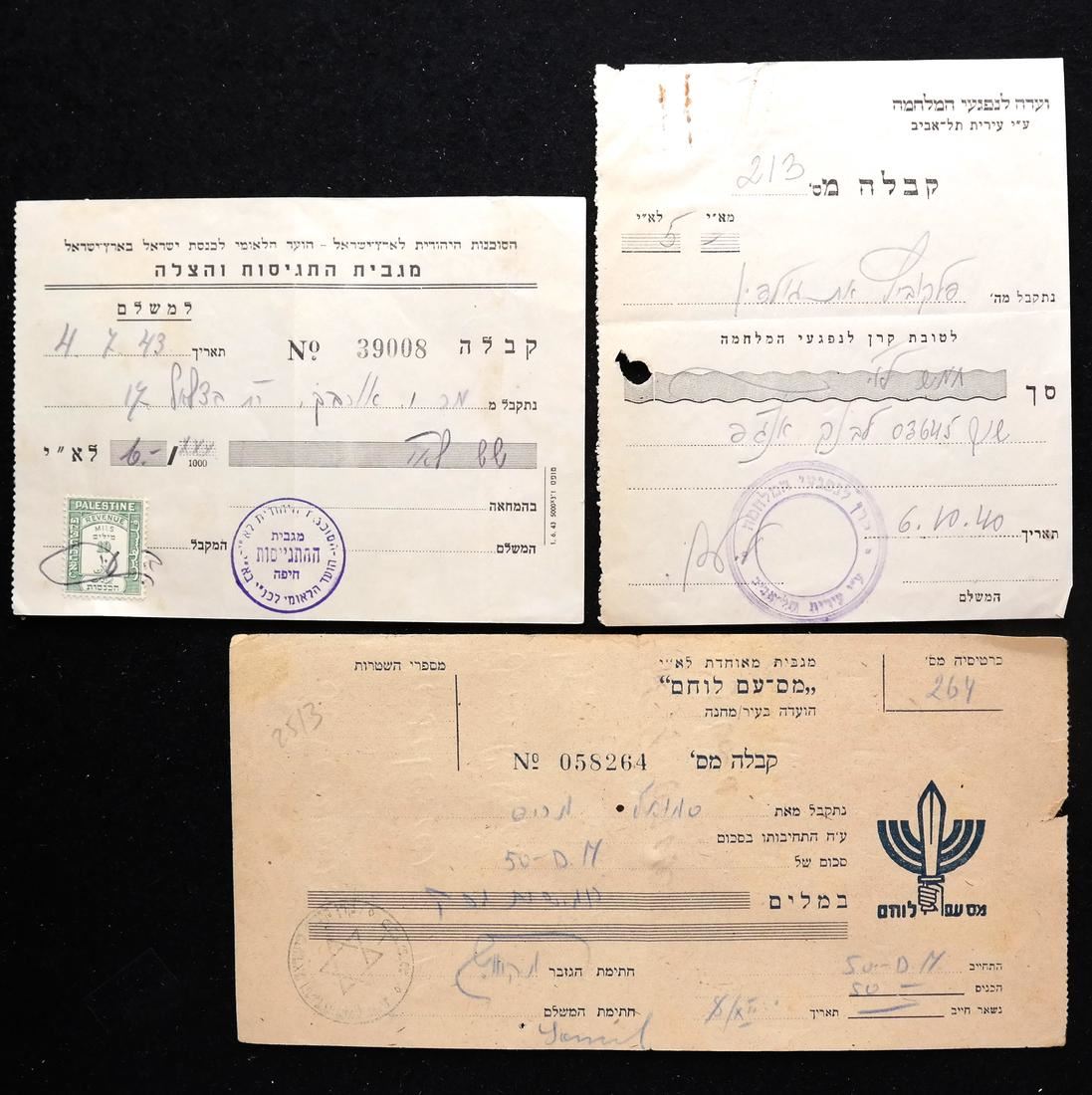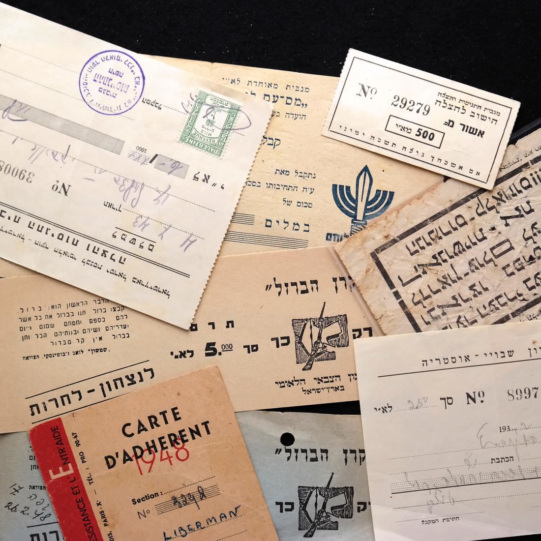 Selection of different Jewish refugee related items including Iron Fund donation receipts, Austrian Jewish prisoner fund receipt, and related material.