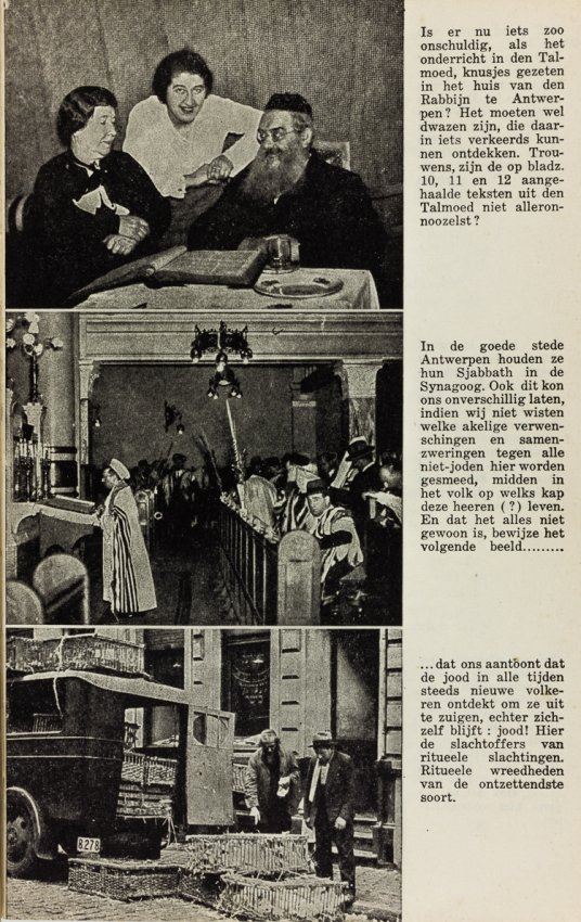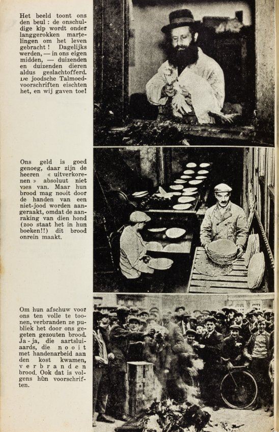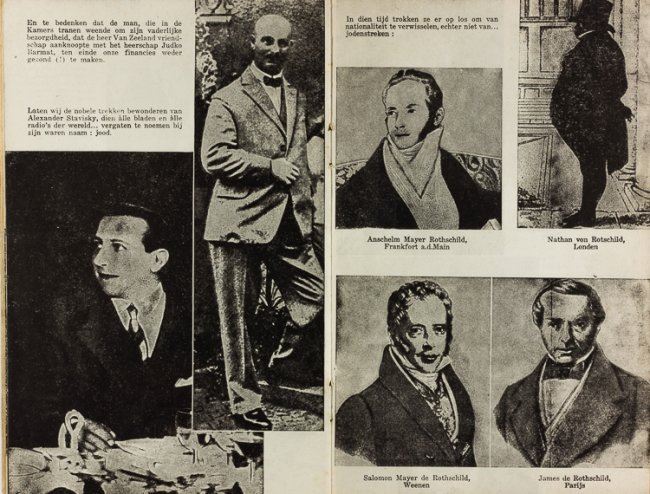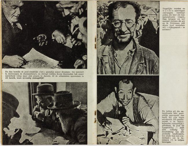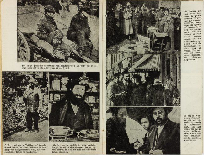 Rare Flemish anti-Semitic book "Joden Zijn Ook Menschen"("Jews Are People Too") by Belgian fascist politician Jef van de Wiele (1903-1979), printed by Steenlandt Printers, Brussels, 1942. The cover bears an image of a leering Jew, with very insulating text and photos within. Pejorative photos of Eastern European Jews, Rothschilds, Morgentah and Baruch and joined with text labeling them as "parasites?conspirators?revolutionaries". Van de Wiele would be jailed for 17 years at war's end.