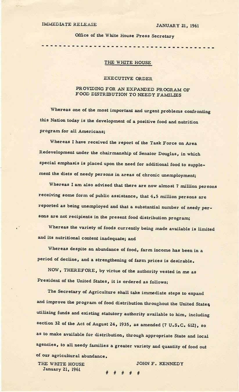 Original press release of John F. Kennedy's first Executive Order, made on his first full day in office as President, dated 21 January 1961. The order mandates an increase in the quantity and variety of foods donated for needy households and reads in part, ''…Whereas the variety of foods currently being made available is limited and its nutritional content inadequate. The Secretary of Agriculture shall take immediate steps to expand and improve the program…'' Document, measuring 8.5'' x 14'' on one page, is in fine condition.