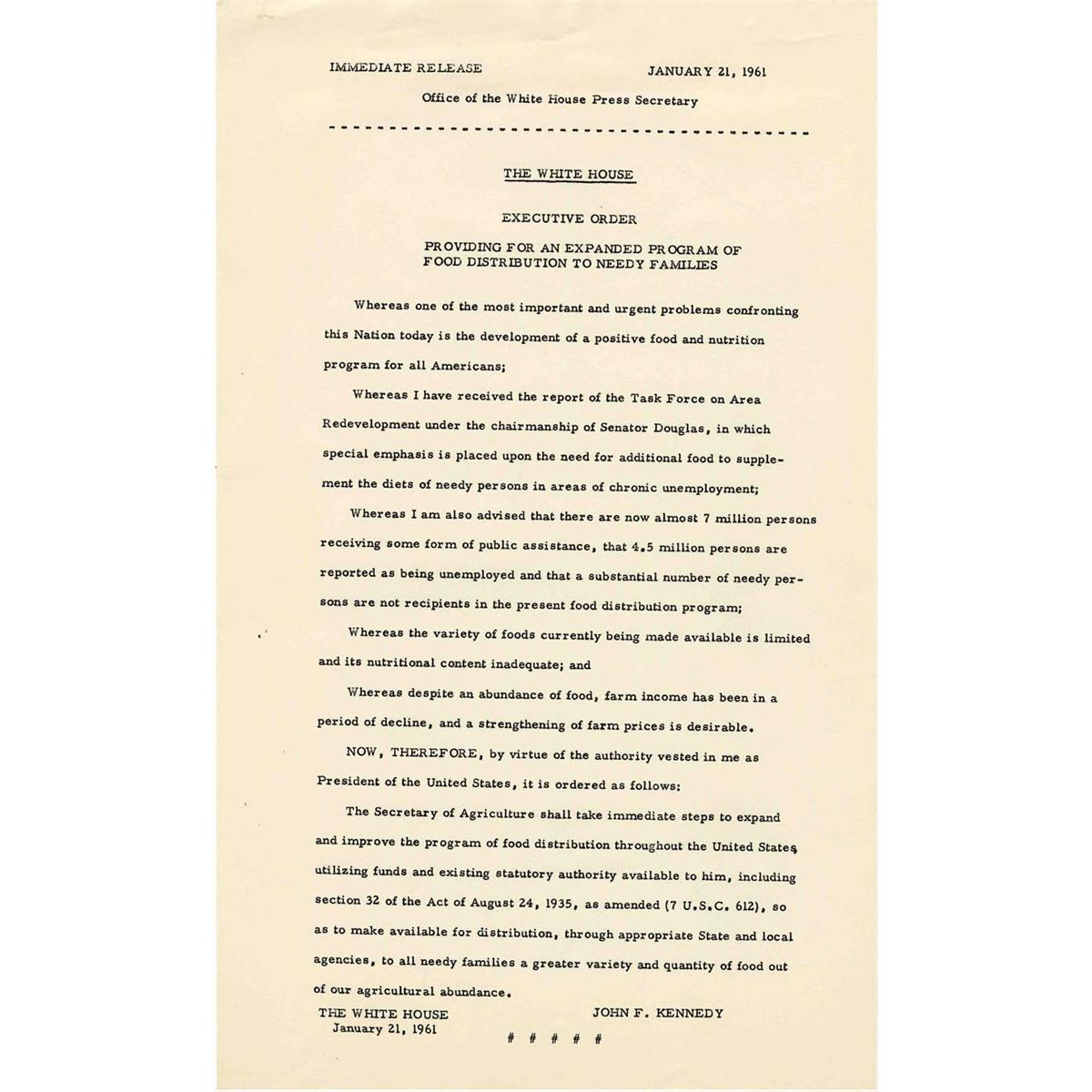 Original press release of John F. Kennedy's first Executive Order, made on his first full day in office as President, dated 21 January 1961. The order mandates an increase in the quantity and variety of foods donated for needy households and reads in part, ''...Whereas the variety of foods currently being made available is limited and its nutritional content inadequate. The Secretary of Agriculture shall take immediate steps to expand and improve the program...'' Document, measuring 8.5'' x 14'' on one page, is in fine condition.