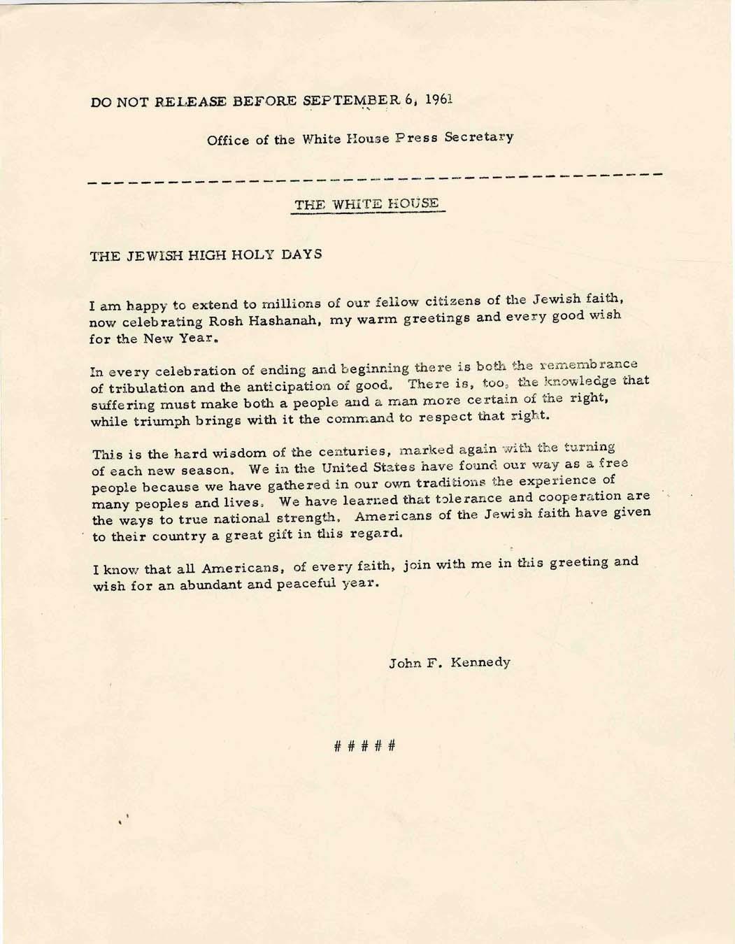Original press release from the John F. Kennedy Administration dated 6 September 1961. Entitled ''The Jewish High Holy Days,'' statement from Kennedy reads in part, ''I am happy to extend to millions of our fellow citizens of the Jewish faith, now celebrating Rosh Hashanah, my warm greetings and every good wish for the New Year…We have learned that tolerance and cooperation are the ways to true national strength…'' Measures 8.5'' x 11'' in near fine condition.