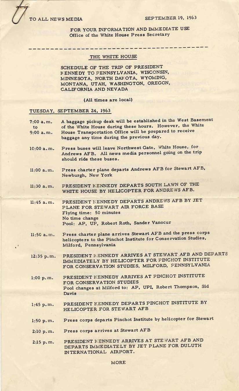 Original itinerary from 19 September 1963 for a visit by President Kennedy to the Midwest and West Coast. Issued to the press by the Office of the White House Press Secretary, it lists a detailed schedule, which included a stop at Lassen Volcanic National Park and dedications of Flaming Gorge Dam in Salt Lake City and the Whiskeytown Reservoir. The 8'' x 14 document runs eight pages. Folds, light toning, and a staple at the left corner, otherwise in near fine condition. From the Robert L. White JFK collection.