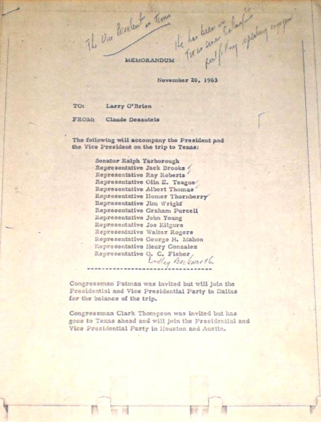 Very rare personal memo from the collection of White House Assistant Press Secretary Malcolm Kilduff, who would make the public announcement of President Kennedy's death. Memo dated 20 November 1963 was used by Kilduff in Texas with his handwritten notes on the second page of people to add to the Presidential party. He writes, ''Join: Add Lt. Gov. Preston Smith / Att Gen Waggoner Carr / Speaker Byron Tunnell''. Two page document measures 8.5'' x 11''. Pages are stapled together and have light wear, overall very good condition.