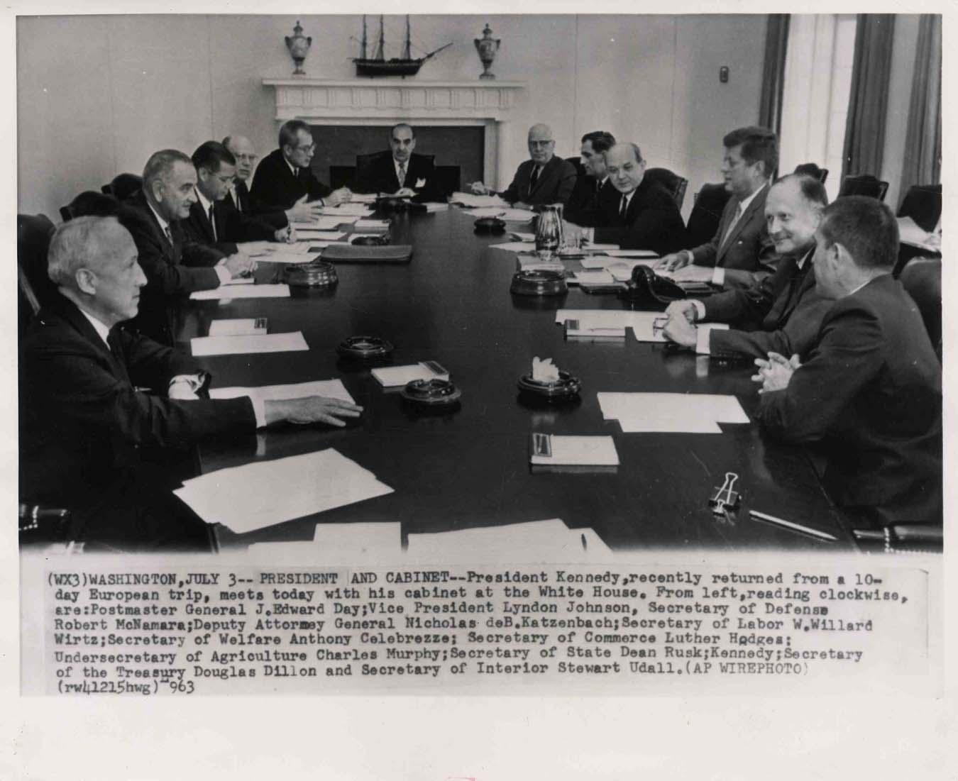1963 wire photo of the Kennedy Administration. 3 July photo shows Kennedy, sitting opposite Vice President Johnson, along with other members of his Cabinet (from left): Postmaster General Day; Johnson; Defense Secretary McNamara; Deputy Attorney General Katzenbach; Labor Secretary Wirtz; Welfare Secretary Celebrezze; Commerce Secretary Hodges; Agriculture Undersecretary Murphy; Secretary of State Rusk; Kennedy; Treasury Secretary Dillon and Interior Secretary Udall. 10'' x 8'' glossy black and white photo in very good condition.