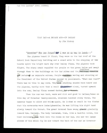 Historically important typed manuscript by Jim Bishop, the noted American author and columnist who wrote the award-winning book, ''The Day Kennedy Was Shot.'' Unsigned first draft of an article for ''The Ladies Home Journal'' entitled: ''That day-a decade ago-in Dallas,'' 18pp., written in 1973 on the tenth anniversary of the assassination of President John F. Kennedy. Over 150 holograph corrections, type-outs, removed passages, etc. are present in this exceptional manuscript which would eventually become Bishop's follow-up to his acclaimed book. In part ''…Mrs. Kennedy had shouted: 'What are they doing to you?' She tried to climb out on the trunk of the car. In a matter of fact way, she said: 'They have shot his head off'…Outside the hospital…a Secret Service agent was arguing in a whisper with Mrs. Kennedy. 'No!, she was saying…you know he is dead…let me alone.' Richard Nixon, who left Dallas that morning (he was working for Coca Cola) said 'The President may have to drop Johnson as his running mate…he is a liability to the ticket.' As Nixon nodded, got into his limousine, a reporter ran to him: 'Hey!' he shouted: 'Kennedy has been shot in Dallas!' Vice President Johnson stood inside the drapes of the clinic cubicle (Parkland Hospital) and said: 'Think he will be able to make the speech at the trade mart?'…'' Incredible manuscript containing recollections not available in any other source. Included in lot is a final draft carbon type-script. Excellent condition.