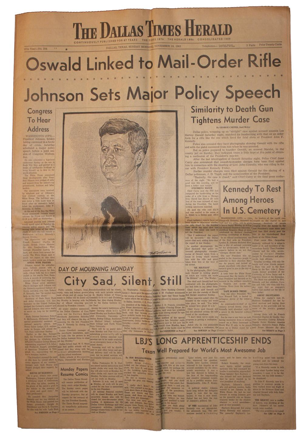 'Dallas Times Herald'' 24 November 1963 Issue -- Reporting on JFK Funeral & Oswald -- ''Oswald Linked to Mail-Order Rifle''