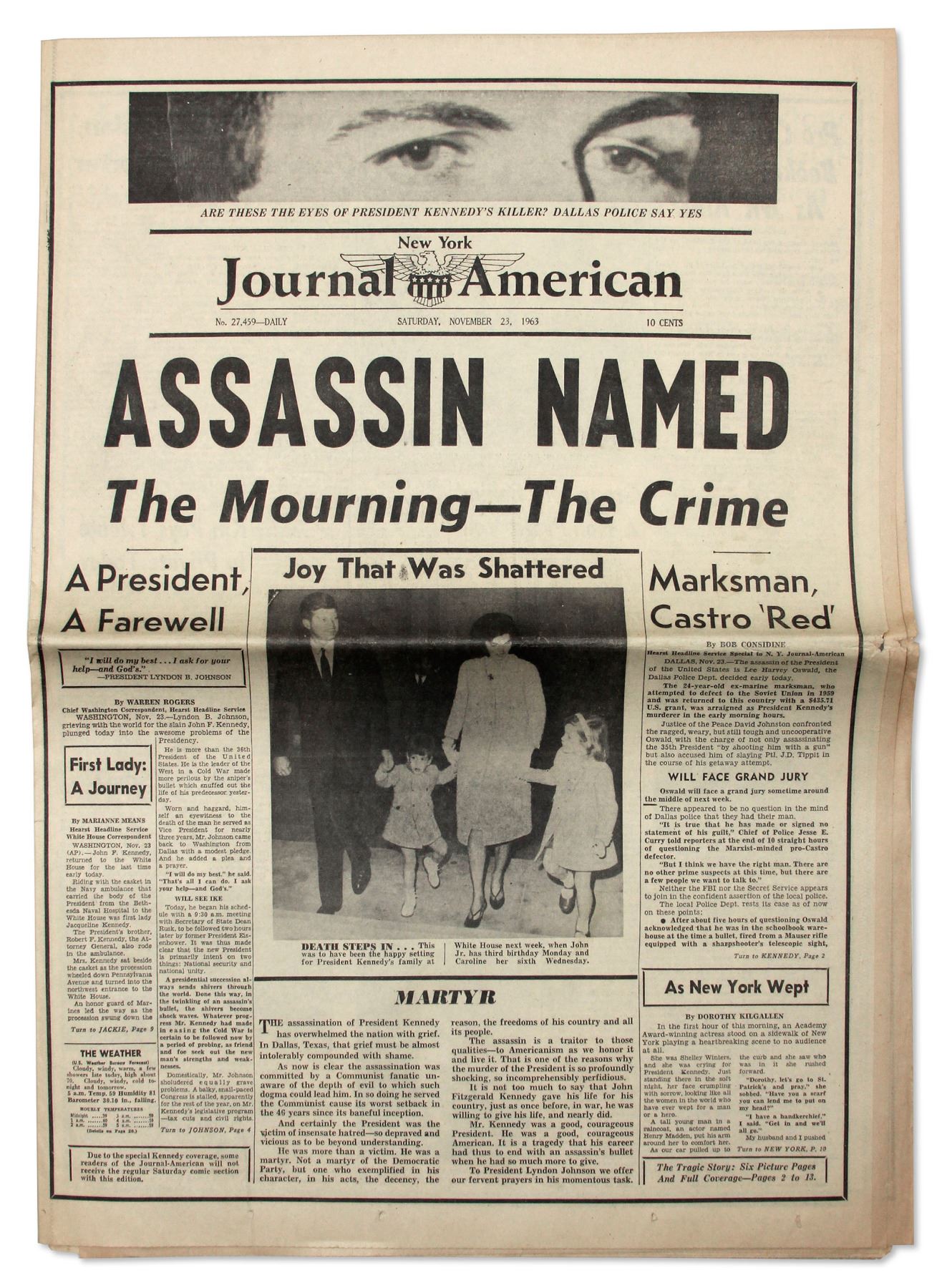 23 November 1963 edition of the ''New York Journal American'' with the headline ''Assassin Named'' under an eerie photo of Lee Harvey Oswald's eyes. Photo of JFK with his family appears over caption, ''Joy That Was Shattered''. Pages within are dedicated to the mourning of JFK in New York and across the United States. Newspaper measures 15.25'' x 22.5'' and runs 24pp. Light toning, else very good condition.