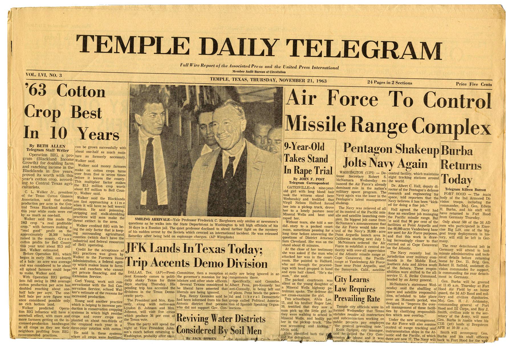 "Temple Daily Telegram" 21 November 1963 Issue -- With "JFK Lands in Texas Today; Trip Accents Demo Division" Headline -- Very Good