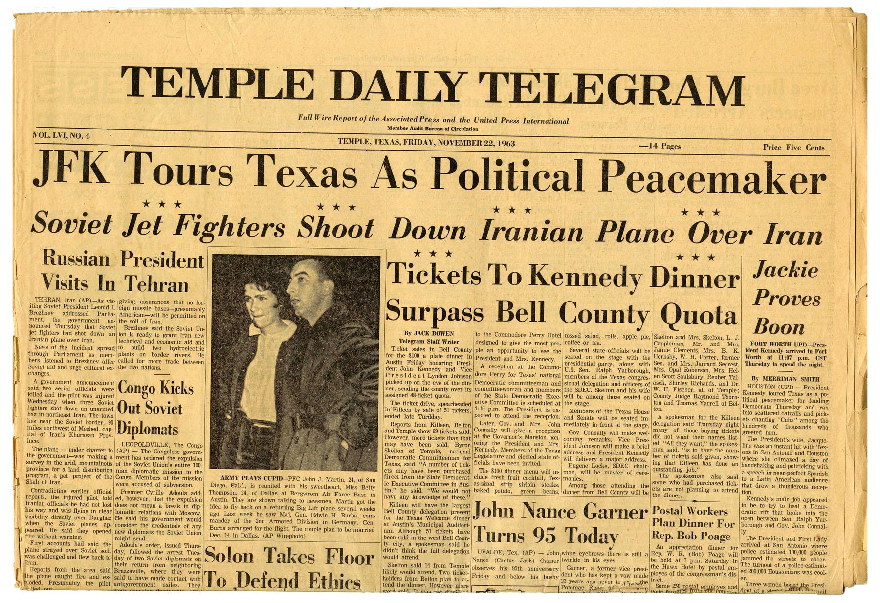 Rare "Temple Daily Telegram" 22 November 1963 Full Issue -- With a "JFK Tours Texas As Political Peacemaker" Headline -- Good Condition