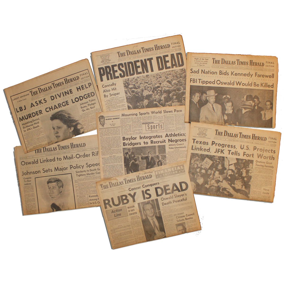 Historic ''The Dallas Times Herald'' final edition from the day JFK was killed, with front page headline reading, ''President Dead'' and a photo of the popular President surrounded by a crowd at the Dallas airport. Complete issue covers the tragic event, with details of Kennedy's death and highlights of his trip to Texas up until the assassination. 22-page newspaper measures 22.5'' x 15'' with toning throughout. Overall in very good condition.