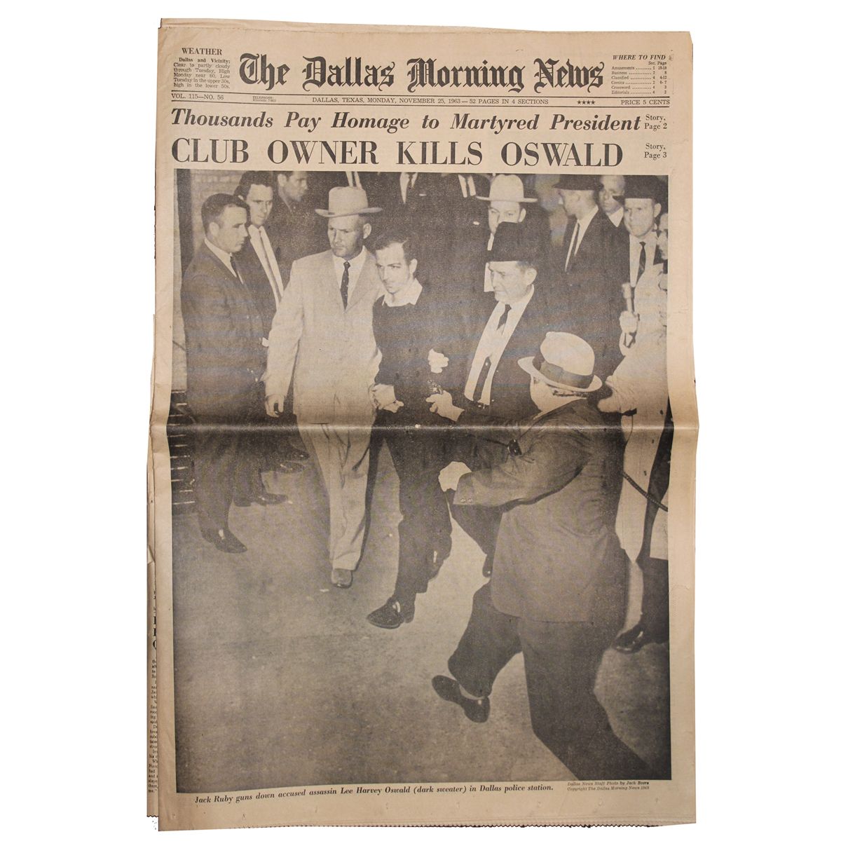 Historic Dallas newspaper ''The Dallas Morning News'' dated 25 November 1963 reporting the death of alleged JFK assassin Lee Harvey Oswald on the previous day -- the same day mourners filed past the President's coffin in the Capitol rotunda. Articles detail plans for Kennedy's funeral as well as reporting on Oswald's shooting. 32 pages include many photos of the Kennedy family in mourning. The newspaper, measuring 15.25'' x 23'' unfolded and 15.25'' x 11.5'' folded, shows moderate toning and edge wear. Overall very good condition.