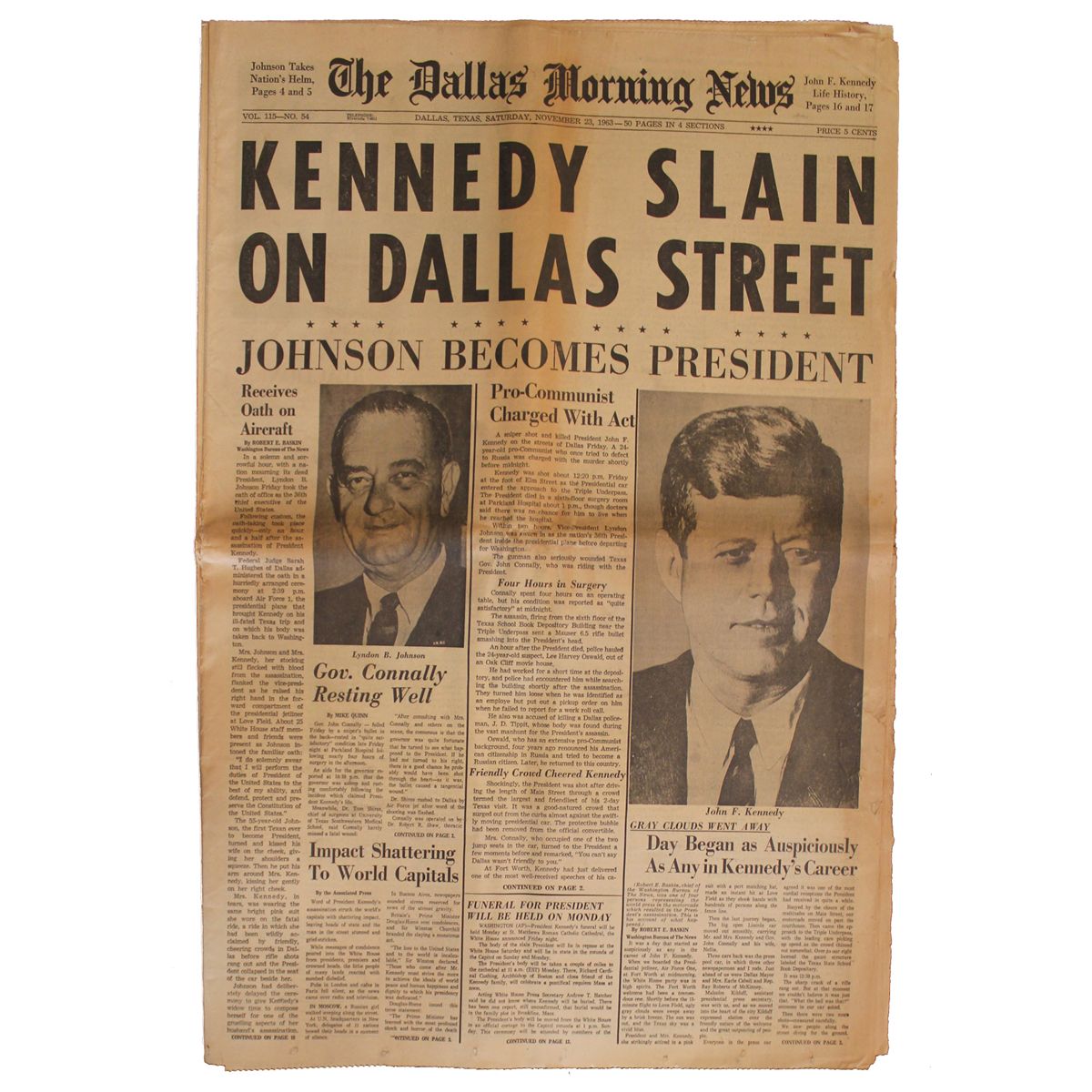 23 November 1963 issue of ''The Dallas Morning News'' detailing JFK's last hours following the 22 November shooting. A subhead reads: ''Johnson Becomes President''. Other articles report on funeral plans, details of Lee Harvey Oswald and a Communist claim that Americans tried to blame Soviets for the assassination. 22 pages include a stunning photo of Kennedy's car after the shooting. Newspaper, measuring 15.25'' x 22.75'', shows moderate toning and chipping. Overall very good condition.