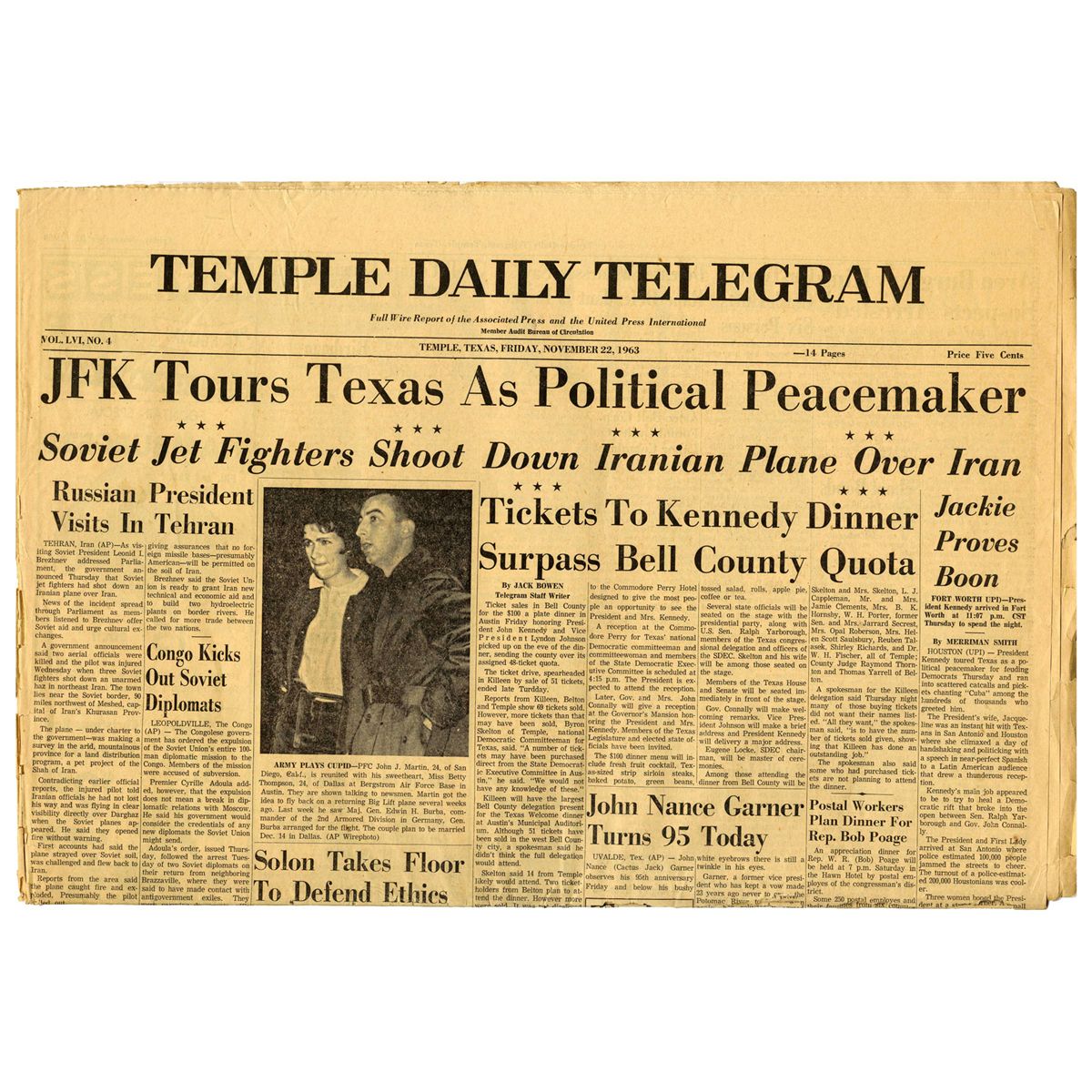 Rare ''Temple Daily Telegram'' 22 November 1963 Full Issue -- With a ''JFK Tours Texas As Political Peacemaker'' Headline -- Good Condition