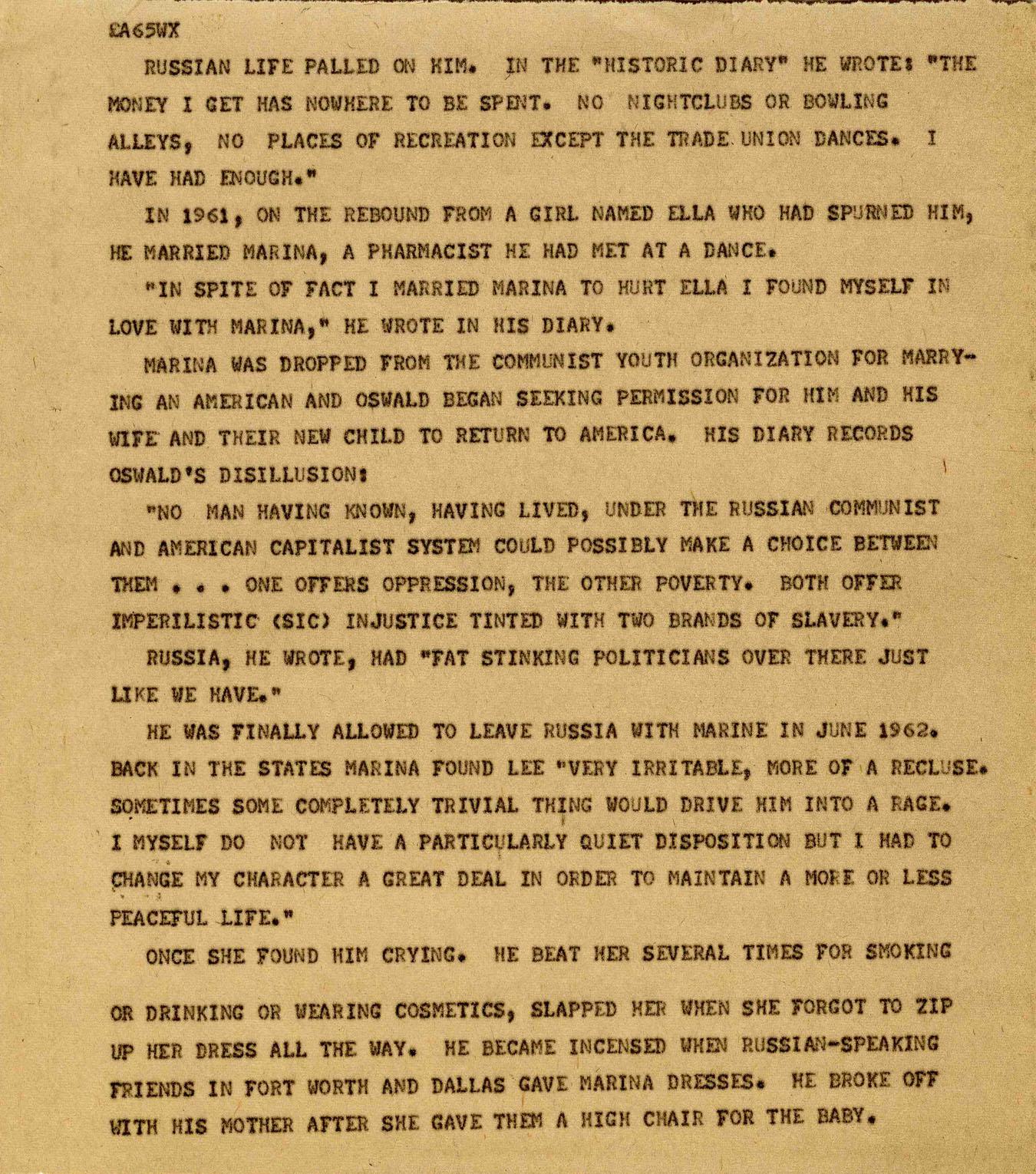 Original teletype from the Warren Commission on the history of Lee Harvey Oswald. Scathing psychological profile includes that Oswald ''…beat his wife for smoking…or wearing cosmetics'' and that Oswald said, ''…in the event of war I would kill any American who put on a uniform in defense of the American government.'' Two pages measure 8.5'' x 11.5'' and 8.5'' x 9.5'', trimmed along the top and bottom. Excellent condition.