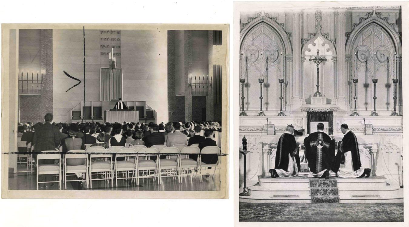 Two original news photos of religious services following President John F. Kennedy's assassination. The first, date stamped 25 November 1963 to verso, shows a worship service at Beth Israel Synagogue. The other shows a service at St. Paul's Cathedral. Each black and white photo measures 6.5'' x 8.5''. Light discoloration and marks to versos; overall very good condition.