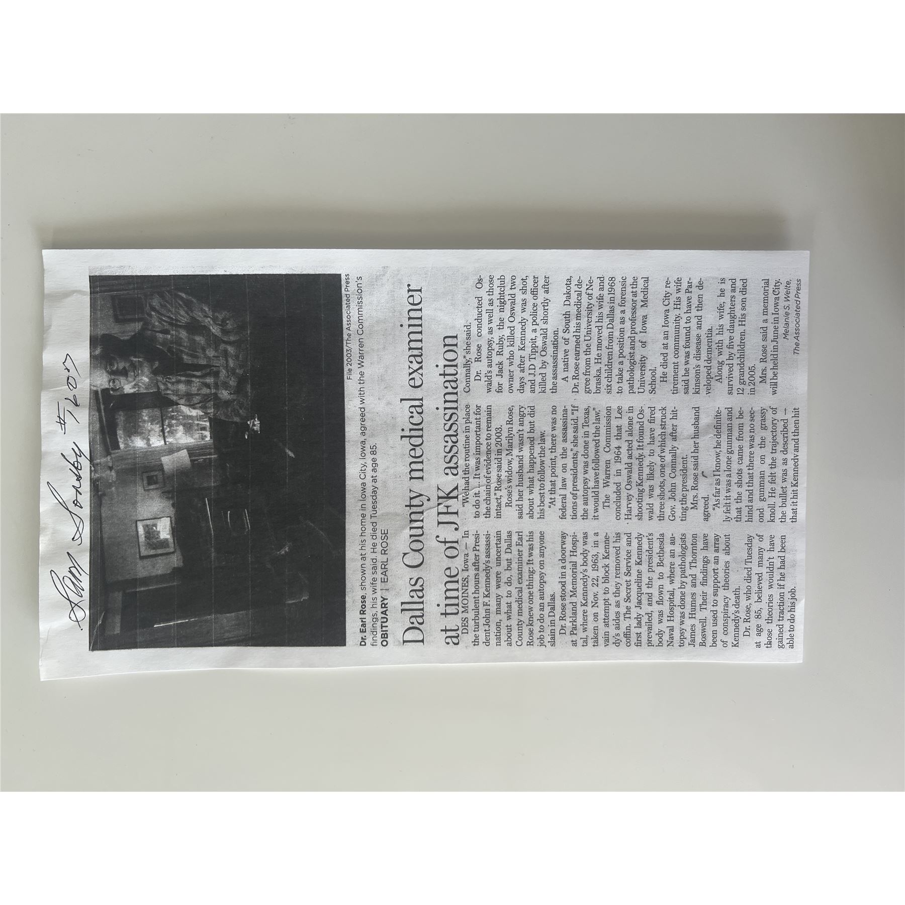 JFK Assassination Sam Sonsby signed newspaper print. 6x11 inches