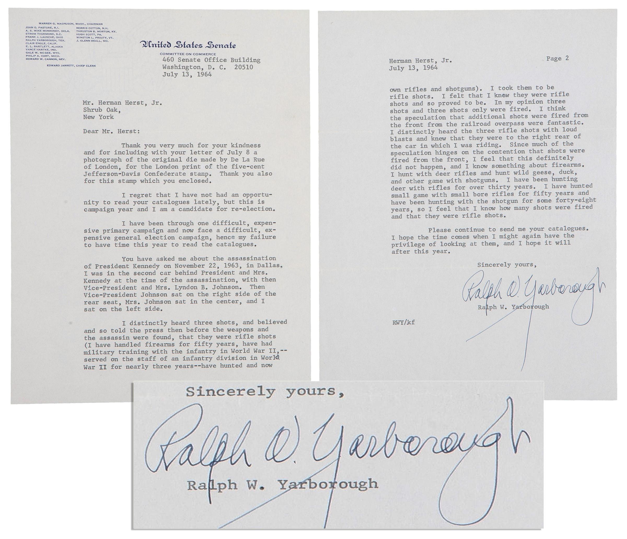 Texas Senator Ralph Yarborough typed letter signed, dated 13 July 1964 on official U.S. Senate stationery. Yarborough was in President Kennedy's Dallas motorcade at the time of the President's assassination, and stresses in this letter that he heard three shots, rather than the conspiratorial four shots proposed by the U.S. House Select Committee on Assassinations in 1979. Replying to a request from Herman Herst Jr. for information on ''the assassination of President Kennedy on November 22, 1963, in Dallas,'' the senator writes, ''I was in the second car behind President and Mrs. Kennedy at the time of the assassination, with then Vice-President and Mrs. Lyndon B. Johnson…I distinctly heard three shots, and believed and so told the press then before the weapons and the assassin were found, that they were rifle shots…I took them to be rifle shots. I felt that I knew they were rifle shots and so proved to be. In my opinion three shots and three shots only were fired. I think the speculation that additional shots were fired from the front from the railroad overpass were fantastic. I distinctly heard the three rifle shots with loud blasts and knew that they were to the right rear of the car in which I was riding. Since much of the speculation hinges on the contention that shots were fired from the front, I feel that this definitely did not happen, and I know something about firearms…'' Letter measures 8'' x 10.5'' on two pages, with minor toning and folds. Includes original envelope. Near fine.