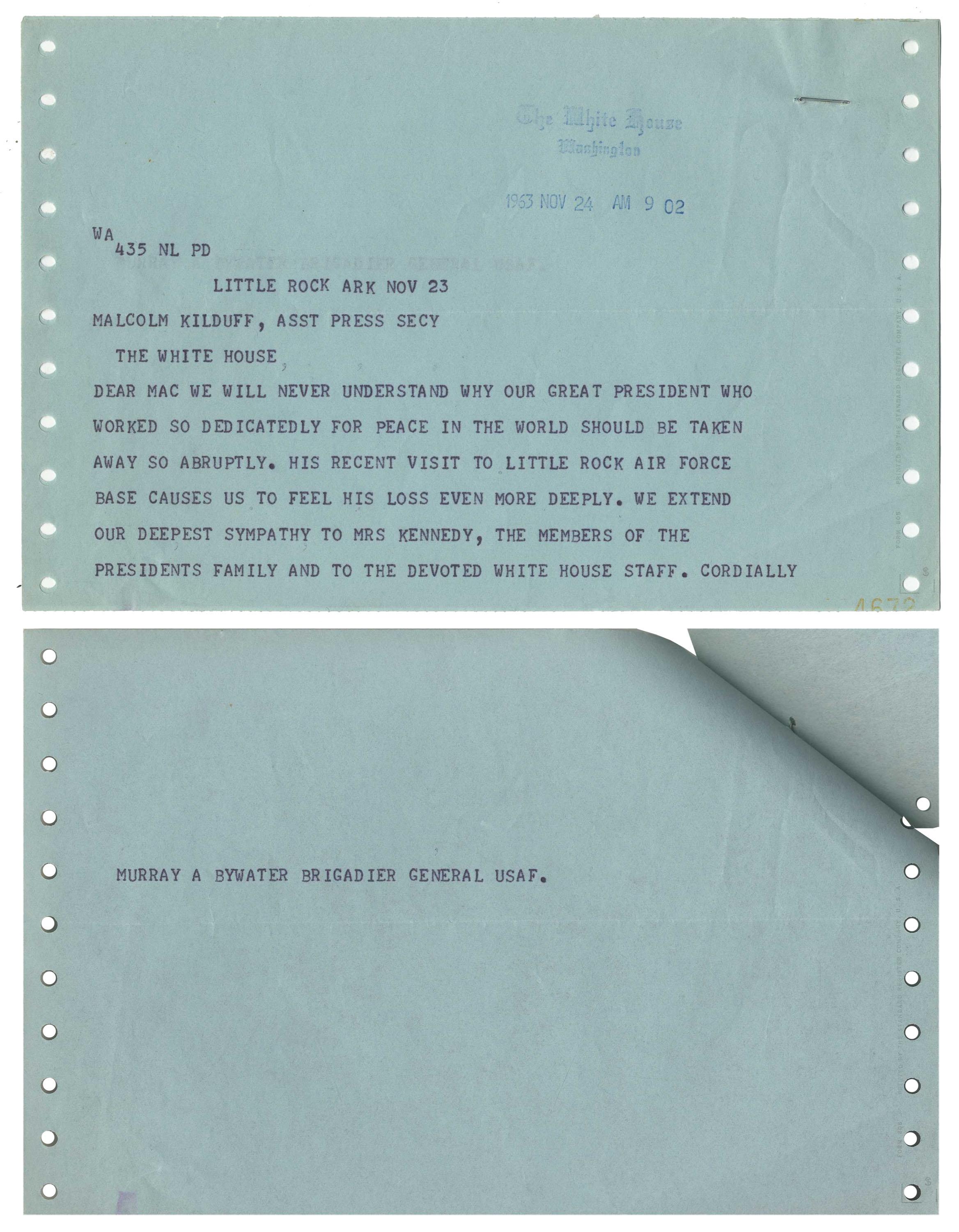 Extremely rare telegram stamped ''The White House / Washington / 1963 NOV 24 AM 9 02'' regarding the death of President Kennedy. Addressed to Assistant Press Secretary Malcolm Kilduff, General Murray Bywater writes, ''Dear Mac We will never understand why our great President who worked so dedicatedly [sic] for peace in the world should be taken away so abruptly…'' Telegram is on two 8.5'' x 5.5'' light blue pages with all but ''Murray A Bywater Brigadier General USAF'' on the first page. Stapled together and previously folded, else fine.