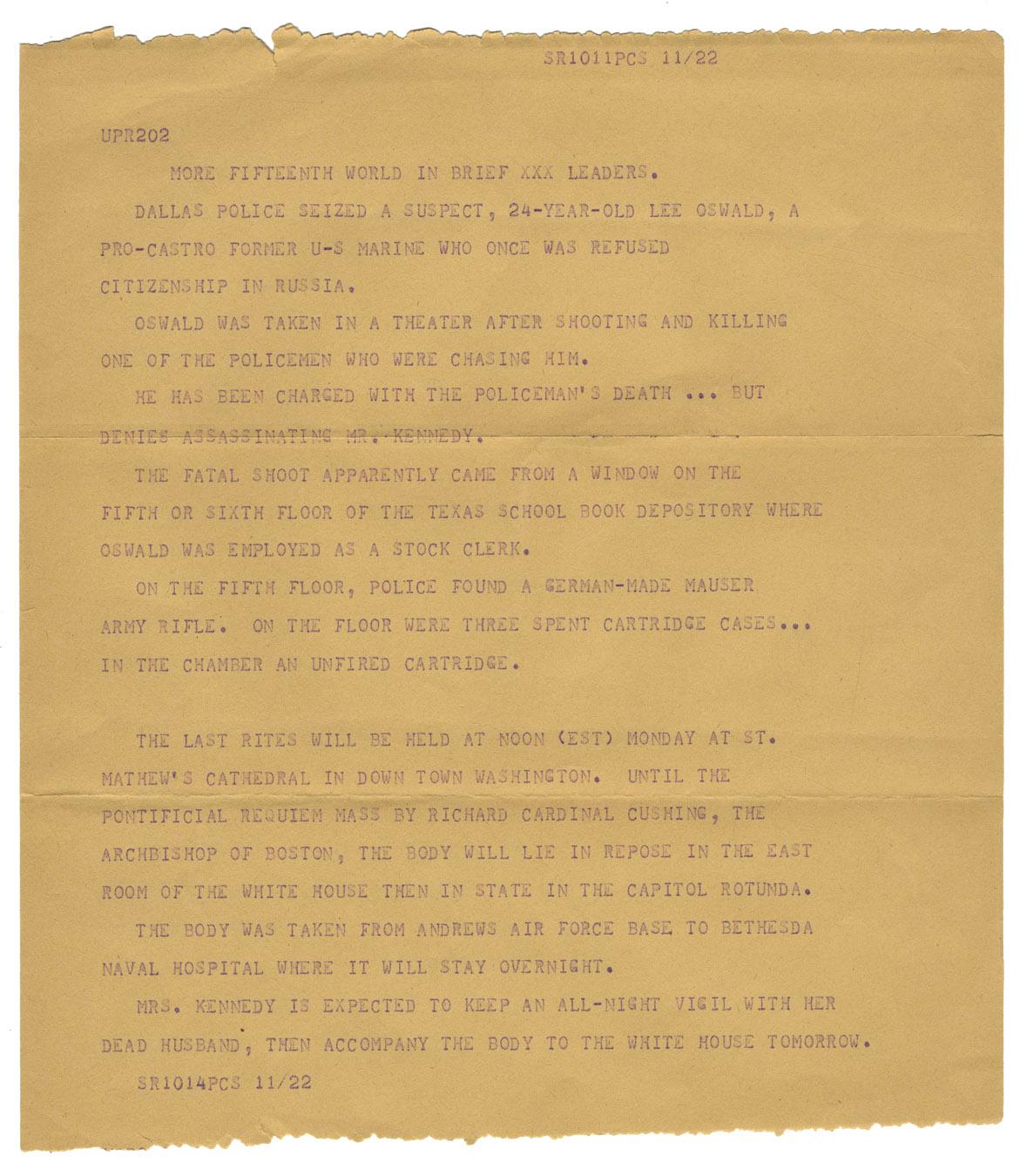 Detailed teletype regarding the aftermath of President John F. Kennedy's assassination, including notice of assailant Lee Harvey Oswald's apprehension. Reads in part: ''…Dallas police seized a suspect, 24-year-old Lee Oswald, a pro-Castro former U-S marine who once was refused citizenship in Russia….He has been charged with the policeman's death…but denies assassinating Mr. Kennedy…'' Teletype, measuring 8.5'' x 9.5'', has two horizontal folds, with uneven top and bottom edges. Near fine.