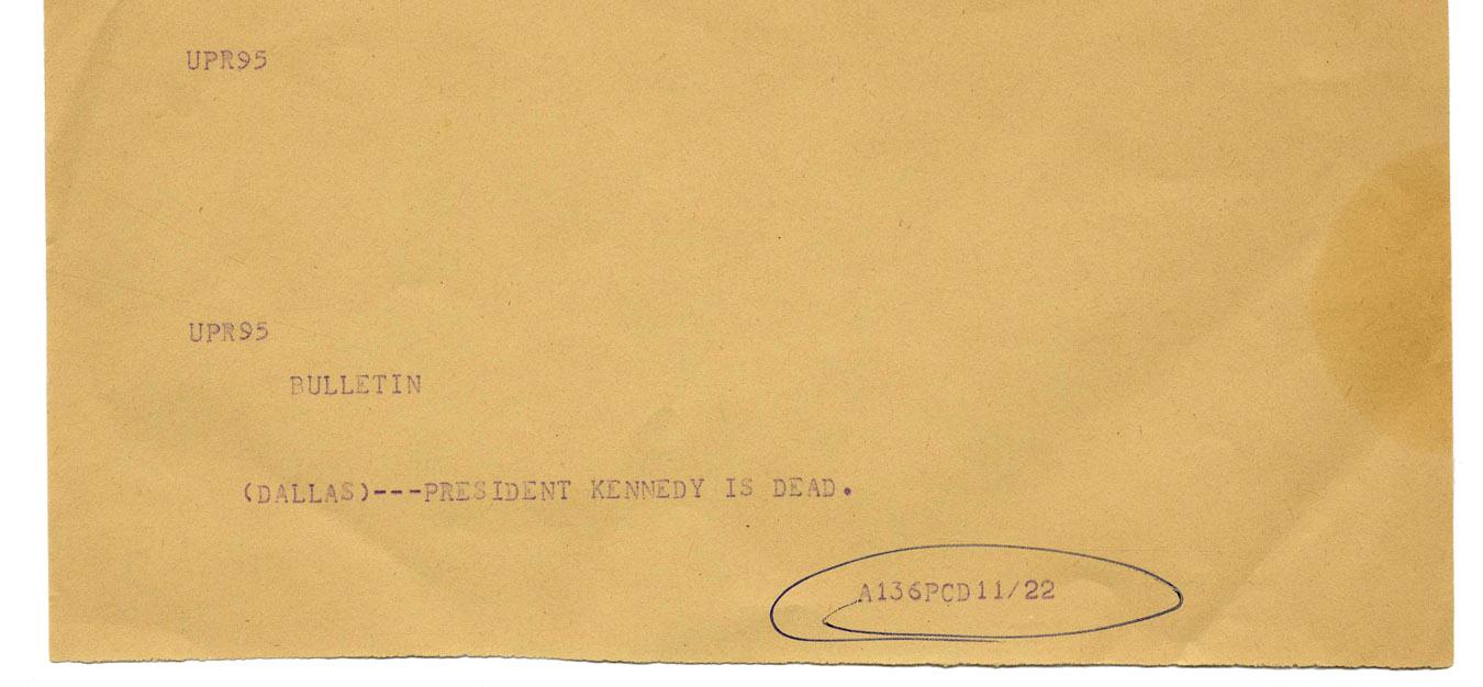 Haunting JFK Assassination Teletype -- Merely Stating, "(Dallas)---President Kennedy is dead." -- 8.5" x 11" -- Near Fine