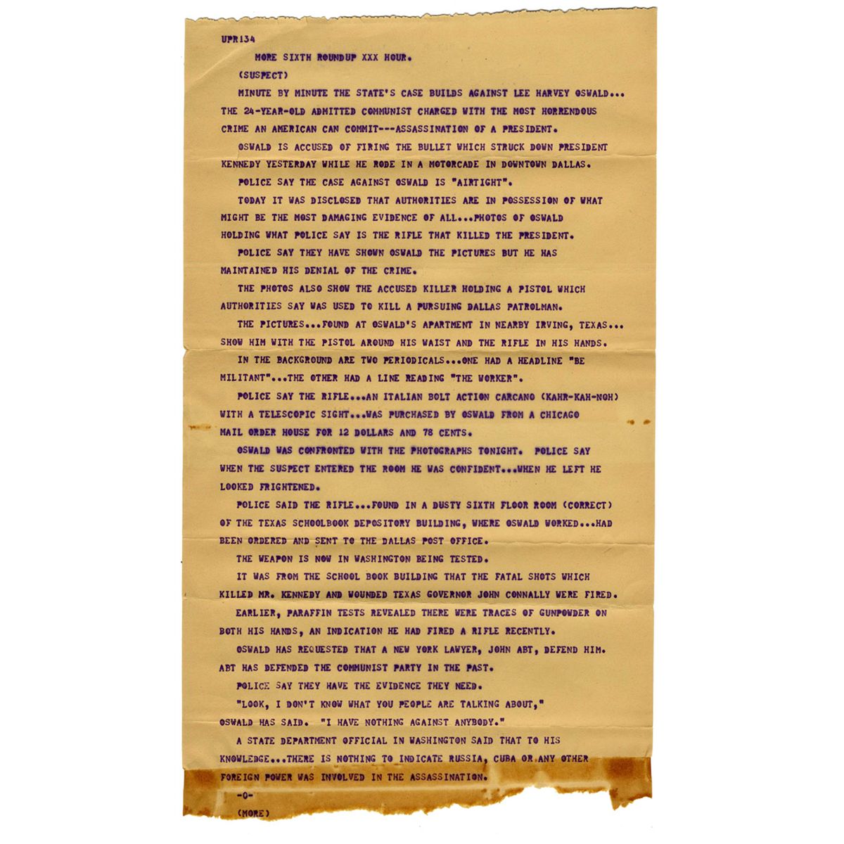 Teletype reads in part: ''...Minute by minute the state's case builds against Lee Harvey Oswald...The 24-year-old admitted communist charged with the most horrendous crime an American can commit -- assassination of a president...Police say the case against Oswald is 'airtight'....Oswald has requested that a New York Lawyer, John Abt, defend him. Abt has defended the communist party in the past...'' Single page teletype, measuring 8'' x 14'', has four horizontal folds and uneven top and bottom edges. Very good overall.
