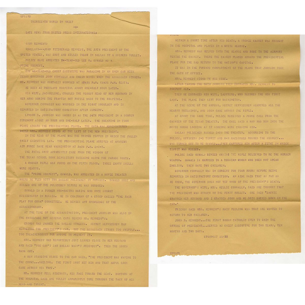 John F. Kennedy assassination teletype, detailing the tragic day in Dallas. Teletype reads in part: ''...His wife, Jacqueline, cradled the bloody head of her husband in her arms during the frantic but futile dash to the hospital...Lyndon B. Johnson was sworn in as the 36th President in a somber ceremony about an hour and one-half later...The oath was administered while Mrs. Kennedy stood at the left of the new president...'' Very long one page teletype, measuring 8.5'' x 32'', has nine horizontal folds and ragged top and bottom edges. Very good.