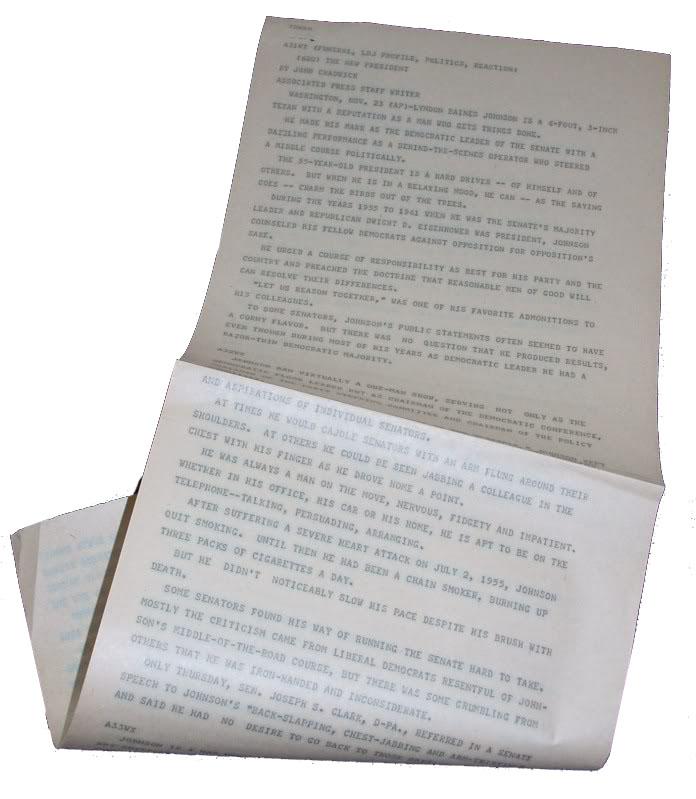 Original John F. Kennedy assassination teletype. Dated 23 November 1963, teletype discusses the reaction to JFK's assassination and gives a profile of his successor. In part: “…Lyndon…Johnson is a 6-Foot, 3-Inch Texan with a reputation as a man who gets things done…He also has a streak of vanity…Johnson sometimes loses his temper, but he is no Pop-Off…” Document measures 8.5'' x 23'' and contains a vertical tear measuring approximately 1'' from the top edge. Otherwise very good condition.