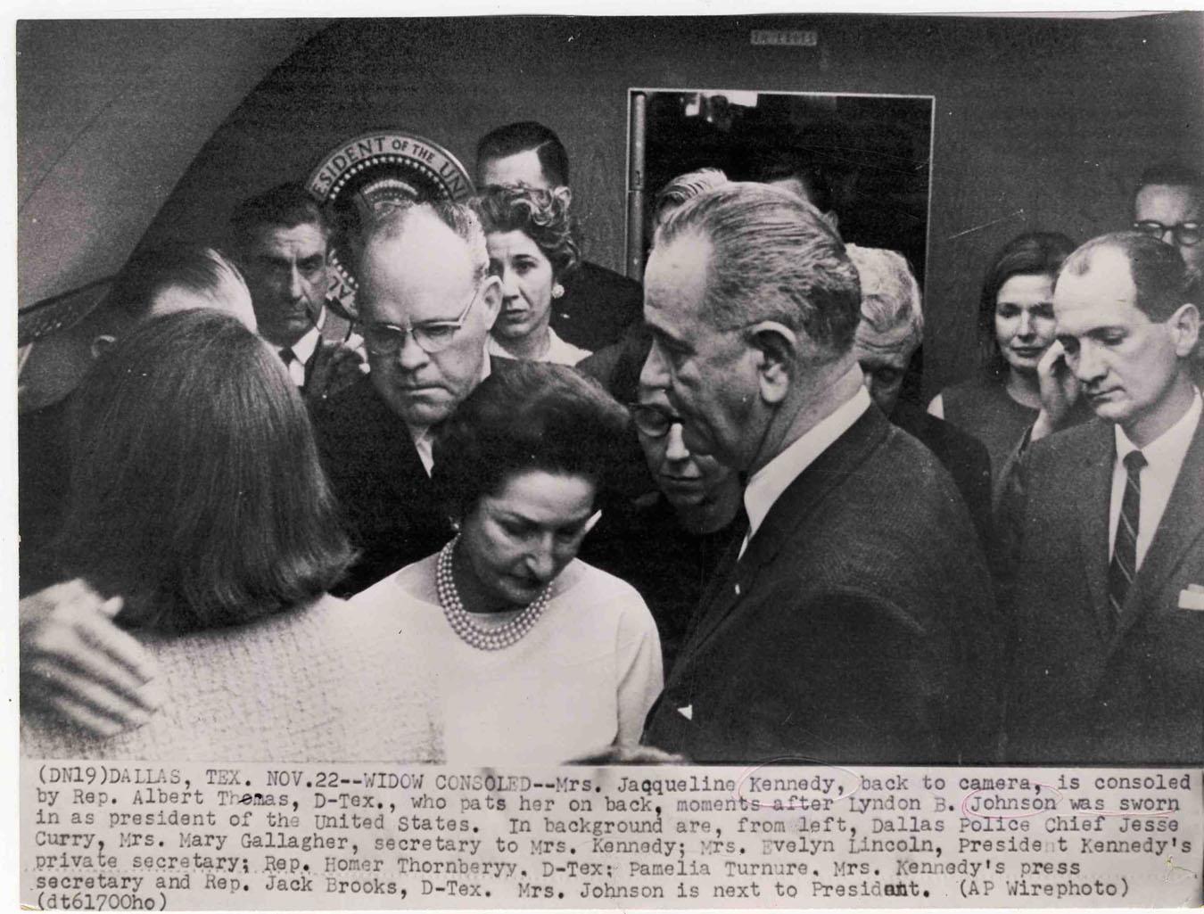Poignant photograph of the occupants aboard Air Force One, taking them back to Washington, DC after JFK's assassination. Associated Press wire photo entitled ''Widow Consoled'' shows Jackie with her back to the camera next to Lady Bird Johnson and Lyndon B. Johnson, shortly after LBJ took the oath of office. 8.75'' x 6.5'' black and white glossy photo has minor creasing and red circling to key names in the description at bottom. Overall very good condition.