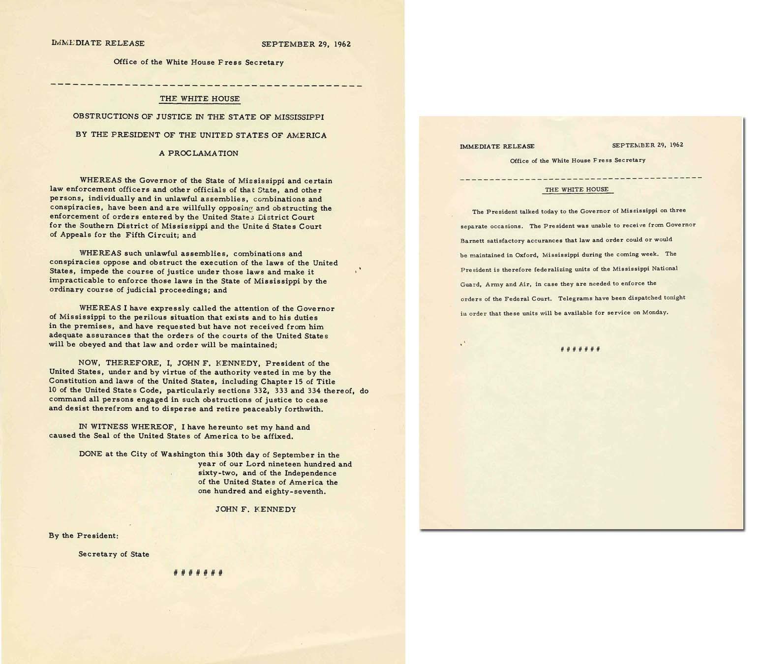 Two original press releases issued by the Kennedy Administration, both dated 29 September 1962. The frustration of the President is palpable in the releases, the first of which proclaims that the Governor of Mississippi and others are ''willfully opposing and obstructing the enforcement of orders'' and commands that they ''cease and desist.'' Second release orders the federalization of the National Guard after deciding that the Governor ''could or would'' not maintain law and order. Releases measure 8.5'' x 14'' and 8.5'' x 11''. Near fine.