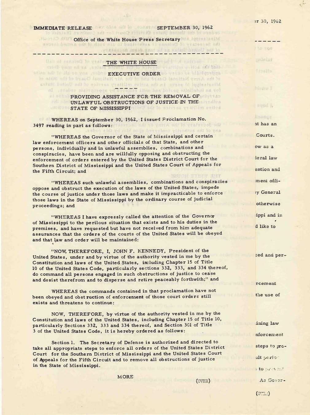 Two original press releases issued by the Kennedy Administration, both dated 30 September 1962. The first, an executive order, instructs the Secretary of Defense to ''take all appropriate steps'' to remove obstructions of justice in Mississippi. The second release is a transcript of the telegram sent to Governor Barnett directly questioning him on his intent in preventing James Meredith from matriculating at Ole Miss. Kennedy requests a reply by the end of that day. Both documents measure 8.5'' x 14''. Very good condition.