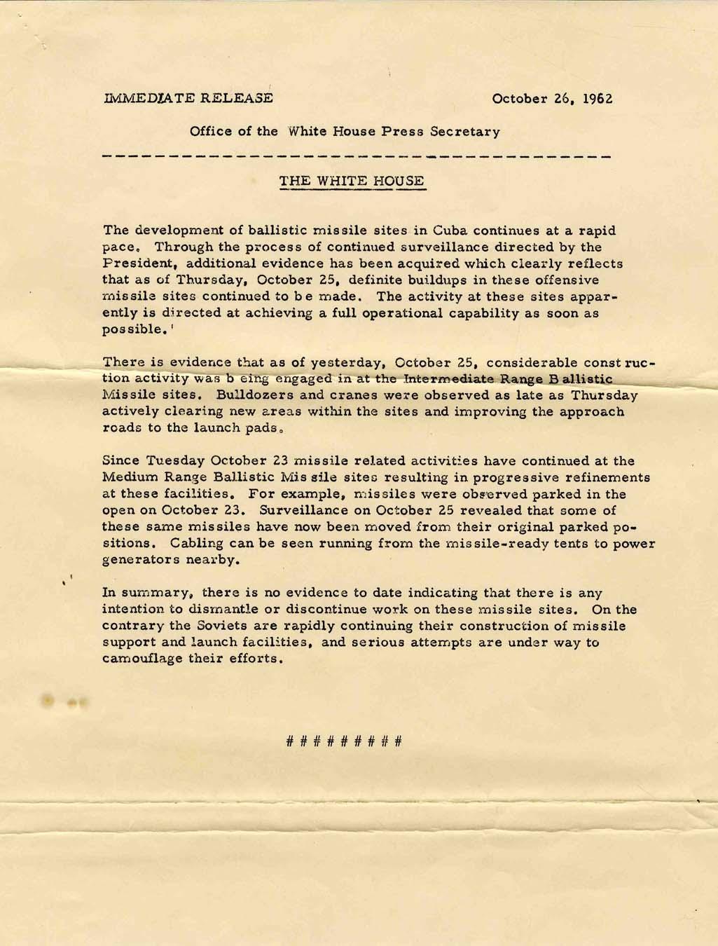 Original press release dated 26 October 1962 issued by the Kennedy White House on the latest developments in the Cuban Missile Crisis. Reads in part, ''The development of ballistic missile sites in Cuba continues at a rapid pace. Through the process of continued surveillance directed by the President, definite buildups in these offensive missile sites continued to be made.'' 8.5'' x 11'' document has staple mark, folds, small stain to lower portion and a trimmed lower border. Very good condition.