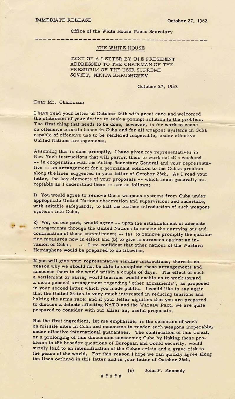 Original press release by the Kennedy Administration, dated 27 October 1962 during the Cuban Missile Crisis. In a letter to Nikita Khrushchev, Kennedy refers to Khrushchev's letter of 26 October: '' You would agree to remove these weapons systems from Cuba…and undertake…to halt the further introduction of such weapons.'' In return, Kennedy pledges to remove a quarantine and not invade Cuba. Document measures 8.5'' x 14''. In very good condition with a staple mark, folds and small margin stain.