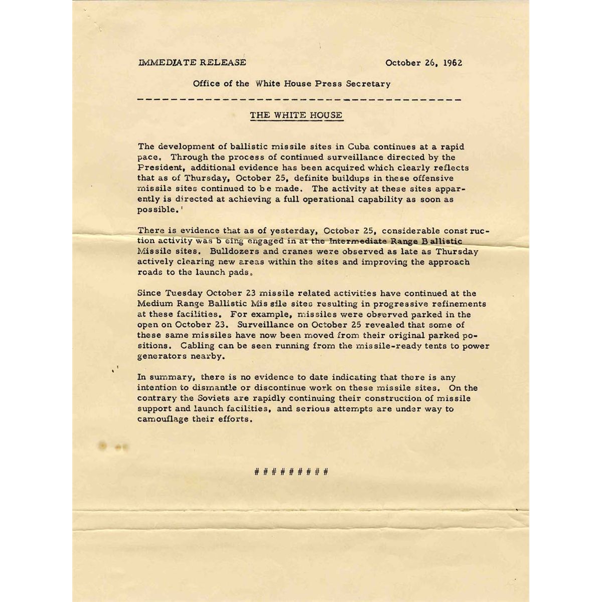 Original press release dated 26 October 1962 issued by the Kennedy White House on the latest developments in the Cuban Missile Crisis. Reads in part, ''The development of ballistic missile sites in Cuba continues at a rapid pace. Through the process of continued surveillance directed by the President, definite buildups in these offensive missile sites continued to be made.'' 8.5'' x 11'' document has staple mark, folds, small stain to lower portion and a trimmed lower border. Very good condition.