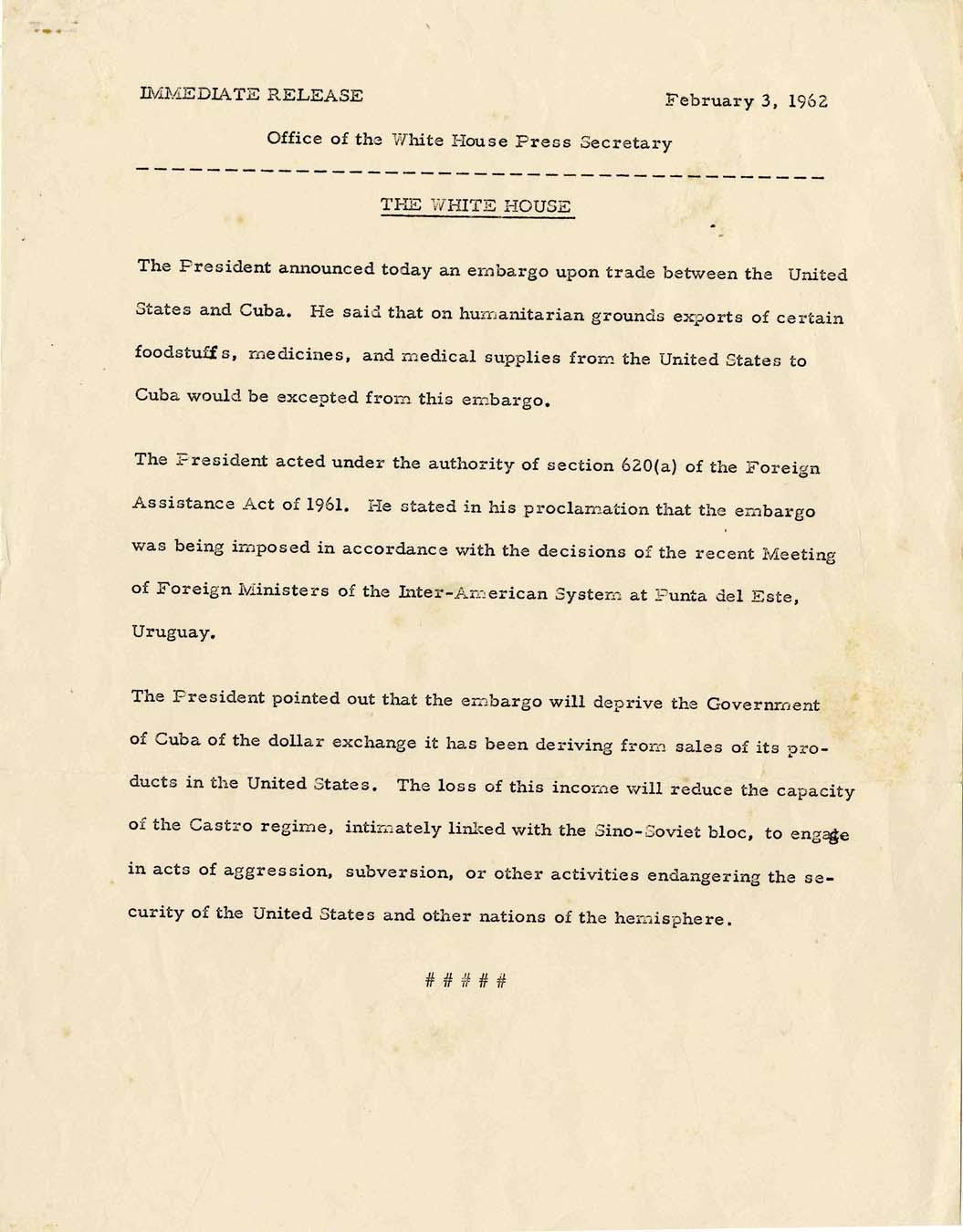 Original document announcing the Cuban trade embargo issued by the Office of the White House Press Secretary, dated 3 February 1962. Here Kennedy decides by Executive Order to widen trade restrictions against the Communist island nation, the first action in a series of escalating events leading to the Cuban Missile Crisis later that year. Release is in near fine condition with light creasing and staple mark. Single page measures 8.5'' x 11''.