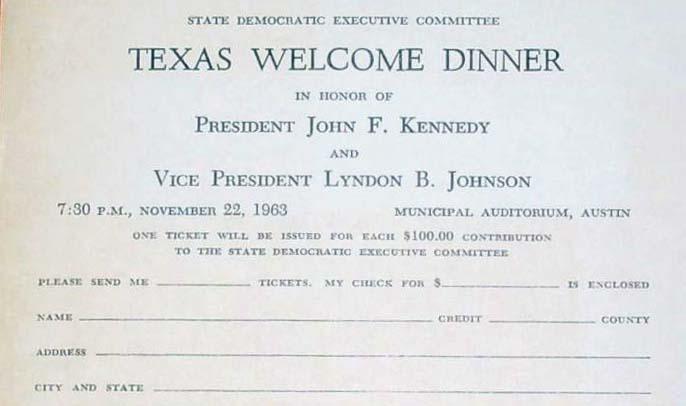 Original invitation to buy tickets for the ''Texas Welcome Dinner'' Democratic fundraiser scheduled to be held the evening of 22 November 1963. Kennedy's itinerary that fateful day in November was to attend a luncheon after the motorcade, then head to Austin for his final appearance on this tour. ''Texas Welcome Dinner'' card measures 5'' x 3'' and offered select individuals to purchase tickets for the event. Toning to left edge, small crease and mounting remnants to verso. Overall, very good condition.