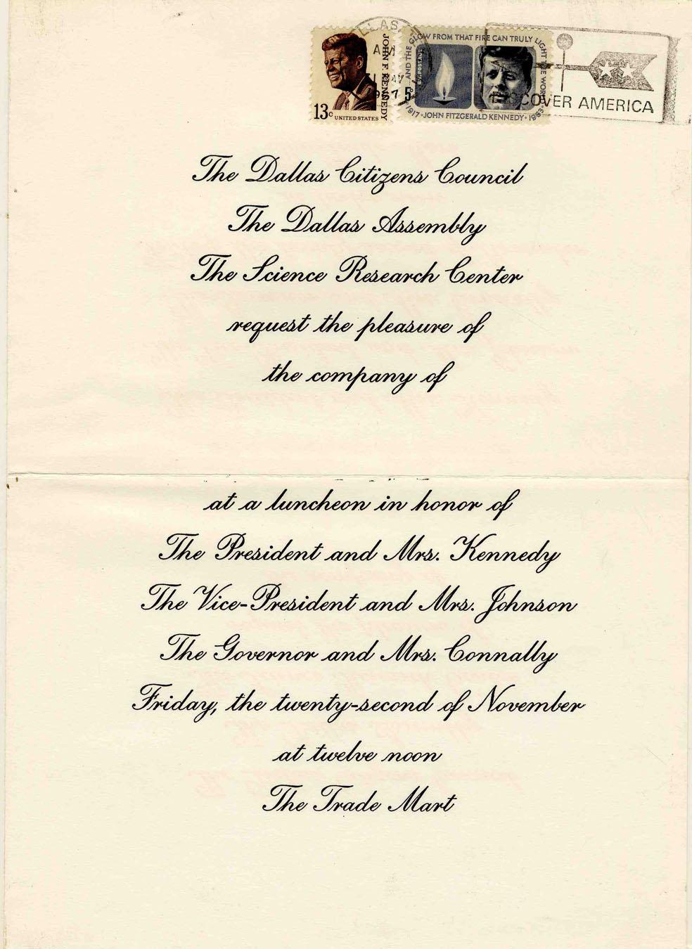 22 November 1963 invitation for a luncheon with John F. Kennedy. Invitation reads in full: ''The Dallas Citizens Council / The Dallas Assembly / The Science Research Center / request the pleasure of the company of [blank] at a luncheon in honor of The President and Mrs. Kennedy / The Vice-President and Mrs. Johnson / The Governor and Mrs. Connally Friday, the twenty-second of November at tewlve noon / The Trade Mart.'' Postmarked stamps with JFK images intact. Measures 7'' x 10''. Fine condition.