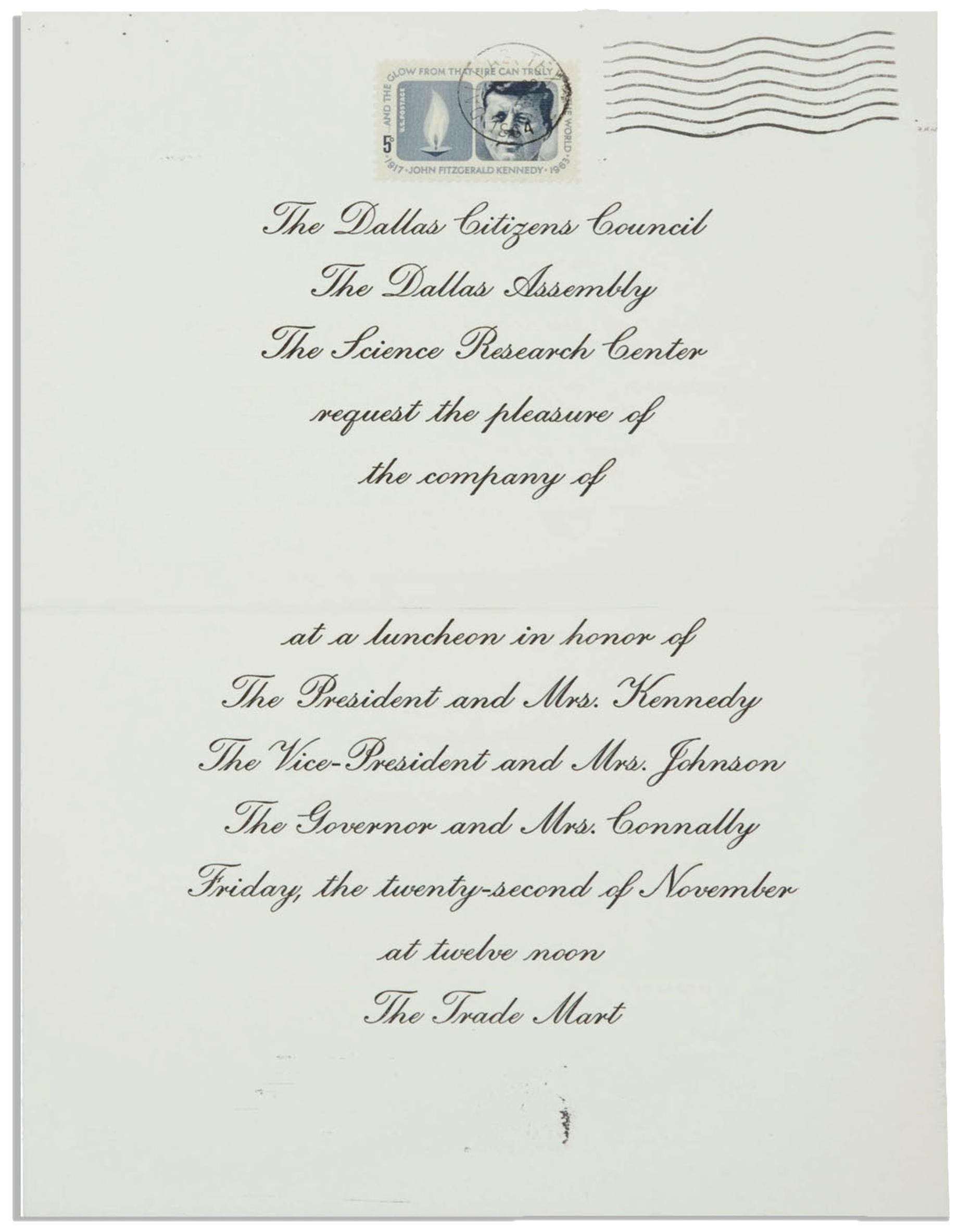 Rare invitation to the Dallas Business & Trade Mart luncheon that was to be held in JFK's honor just after the motorcade the day of his assassination. Invitation is postmarked but with a blank space for the invitee's name. Invitation measures 7'' x 9.75'' with minor toning, else near fine condition.