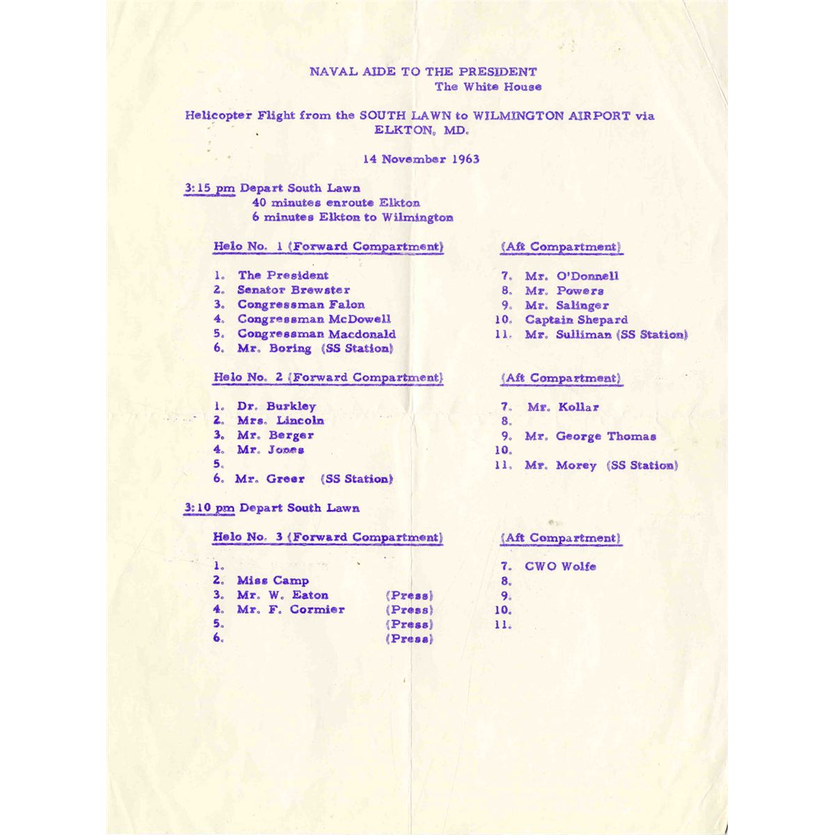 President John F. Kennedy's personal helicopter flight chart for a flight on 14 November 1963, just days before his assassination. Original mimeographed document shows seating for all three Presidential helicopters with ''The President...in the forward compartment of ...Helo No. 1.'' Single page document measures 8.5'' x 11''. Very good condition.