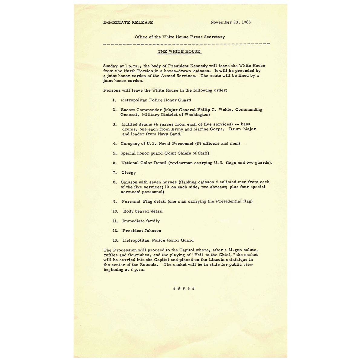 Official JFK funeral press release, dated 23 November 1963, from the ''Office of the White House Press Secretary.'' Reads in part: ''...Sunday at 1 p.m., the body of President Kennedy will leave the White House from the North Portico in a horse-drawn caisson...The Procession will proceed to the Capitol where, after a 21-gun salute, ruffles and flourishes, and the playing of 'Hail to the Chief,' the casket will be carried into the Capitol and placed on the Lincoln catafalque...'' Document on one page measures 8'' x 14'' and is in fine condition.