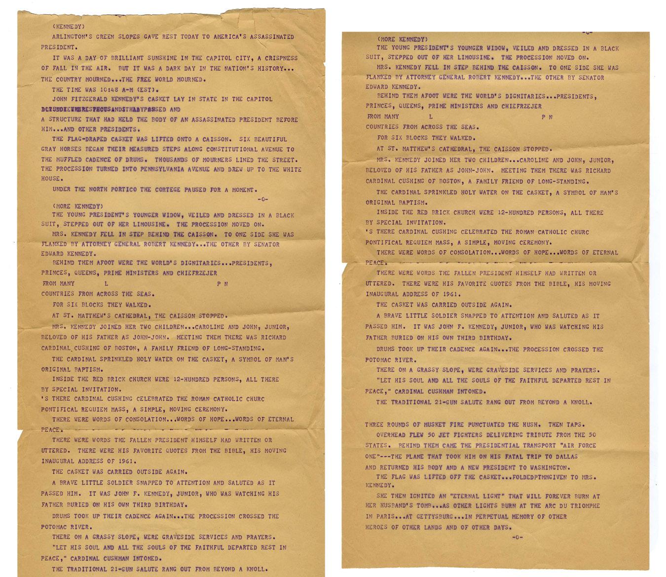 John F. Kennedy funeral teletype, detailing the elaborate procession through Washington D.C. Teletype reads in part: ''…It was a day of brilliant sunshine in the capitol city, a crispness of fall in the air. But it was a dark day in the nation's history…the country mourned…the free world mourned…Six beautiful gray horses began their measured steps along Constitutional Avenue to the muffled cadence of drums…'' One page teletype, measuring 8.5'' x 20'', has three horizontal folds and three tears, all less than 1''. Very good condition.